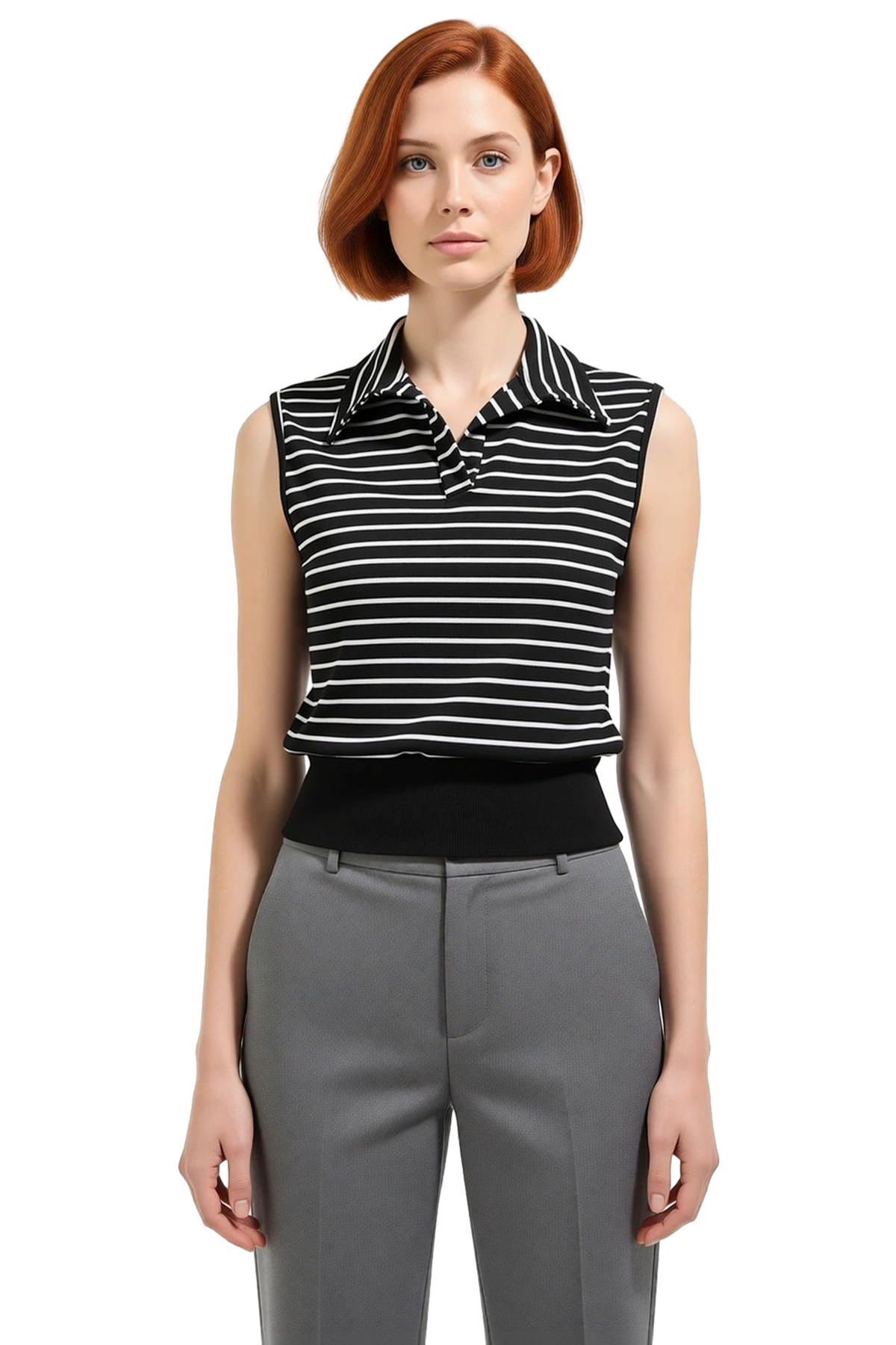 Bluzun polo yakası, şıklığı ve rahatlığı bir arada sunarken, kolsuz tasarımı yaz aylarına uygun bir seçenek sunuyor. Hem günlük hayatta hem de özel davetlerde rahatlıkla kullanabileceğiniz bu bluz, farklı kombinlerle tarzınızı tamamlamanıza olanak tanır. İnce çizgileriyle modern ve şık bir görünüm sunarken, siyah ve beyazın zamansız kombinasyonuyla her zaman trend kalır.