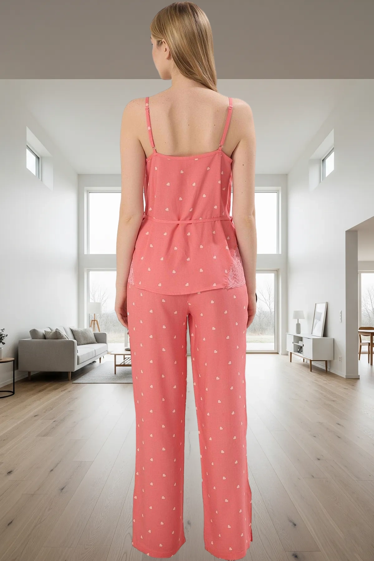 Evde rahat ve şık hissetmek isteyenler için tasarlanan bu pijama takımı, yumuşak dokusuyla gün boyu konfor sunuyor. %100 polyester dokuma kumaştan üretilen takım, nefes alabilir yapısıyla cildinizde serin bir his bırakır. Kalpli desenler ve dantel detaylarıyla modern ve şık bir görünüm sunar. Regular kalıbı ve normal bel yüksekliği sayesinde rahat hareket özgürlüğü sağlar. İnce askılı üst ve boru paça alt ile uyumlu bir görünüm elde edebilirsiniz. Makinede yıkama özelliği sayesinde temizliği oldukça kolaydır.
