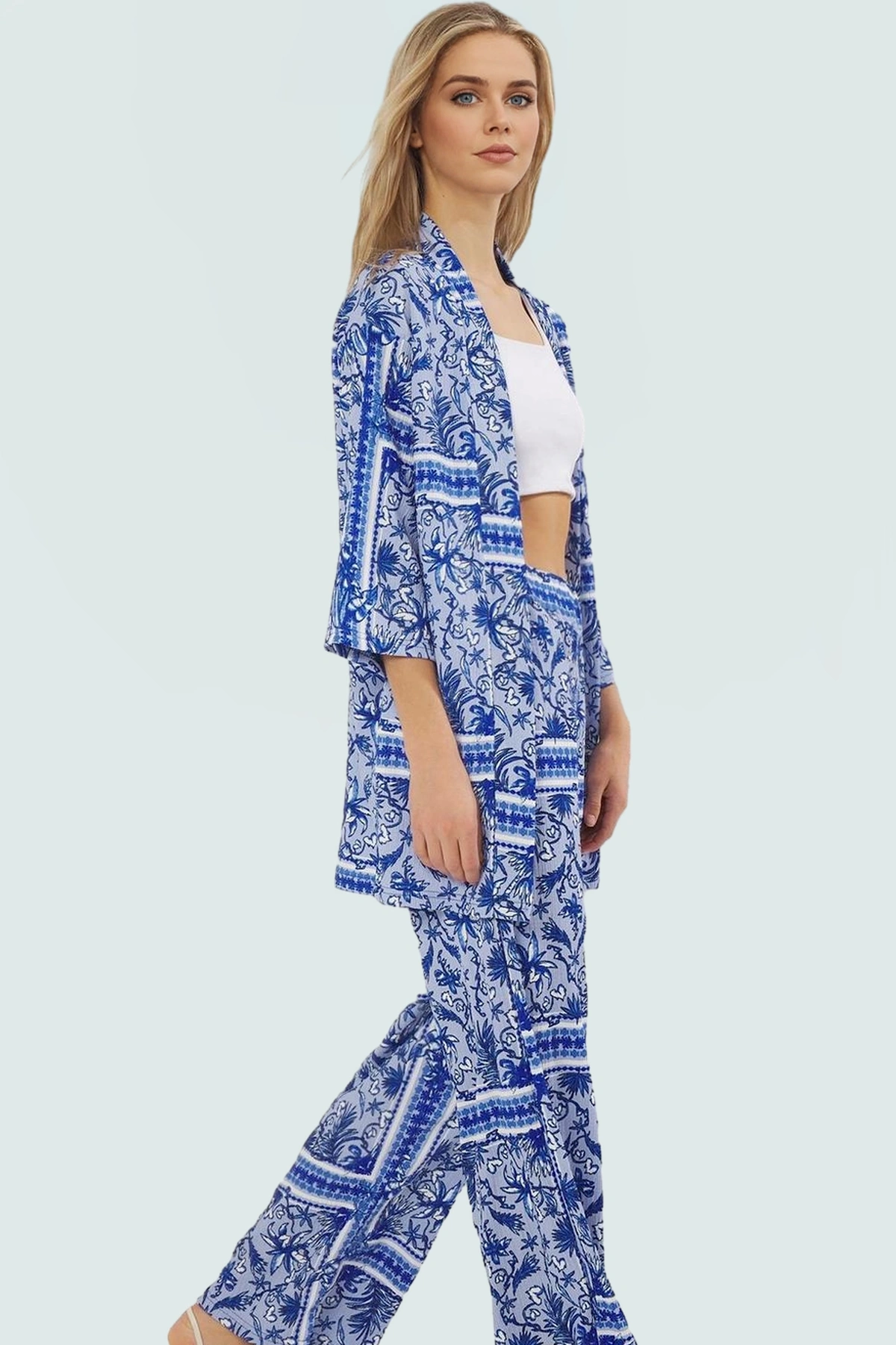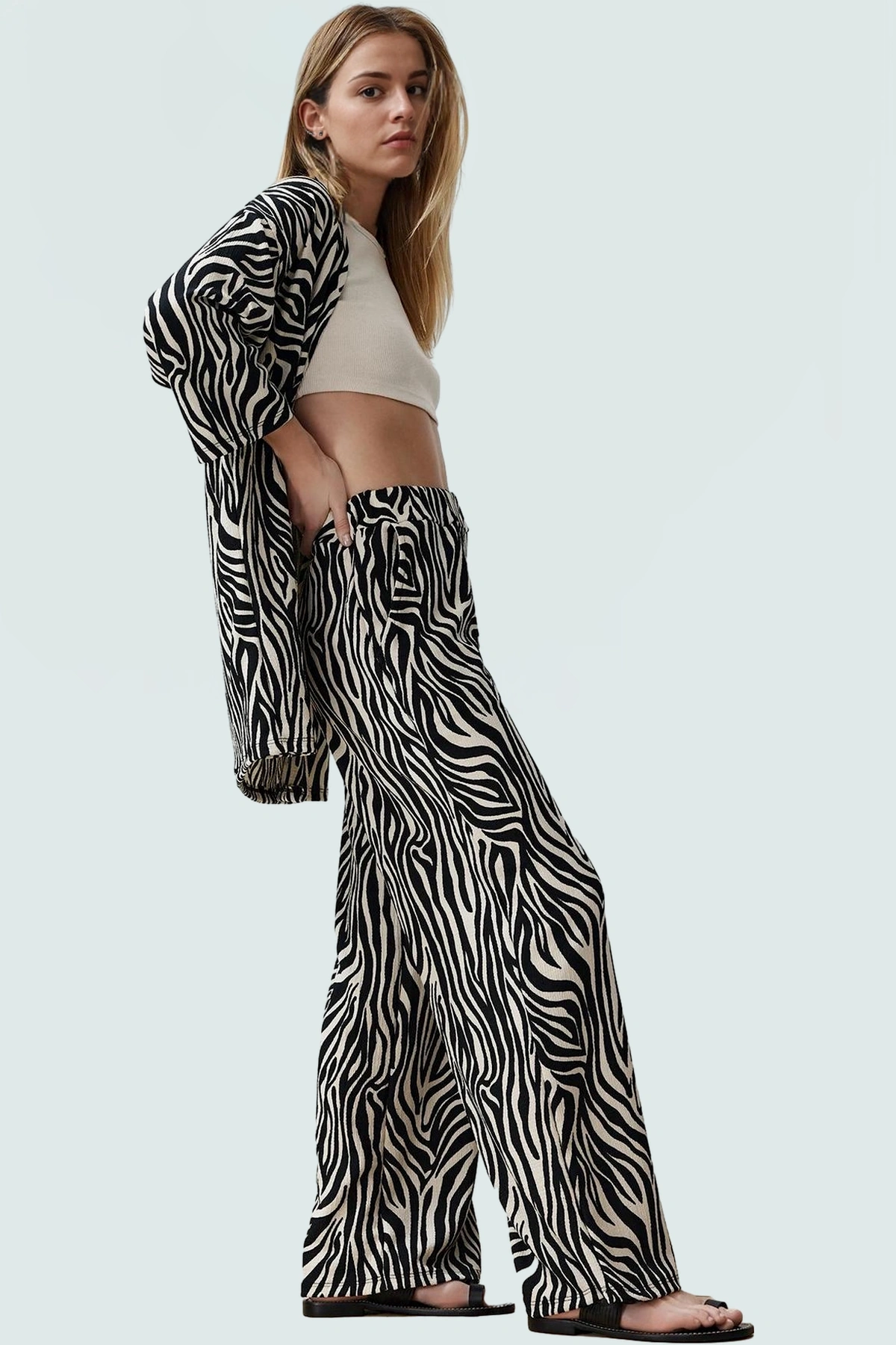 Günlük yaşamınızda hem rahat hem de şık görünmek ister misiniz? Bu leopar desenli örme takım tam size göre! Yumuşak ve nefes alan 100% polyester kumaştan üretilen takım, gün boyu süren konfor sunar. Kimono stili üst ve geniş paçalı alt ile mükemmel bir uyum sağlar. Truvakar kollar ve düşük kol tasarımıyla hareket özgürlüğünüzü kısıtlamadan gününüzü geçirebilirsiniz. Relaxed kalıbı her vücut tipine uyum sağlar.