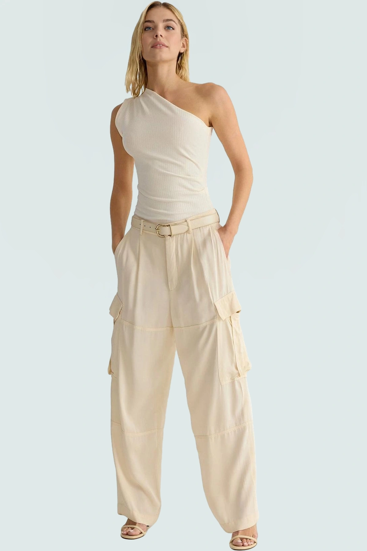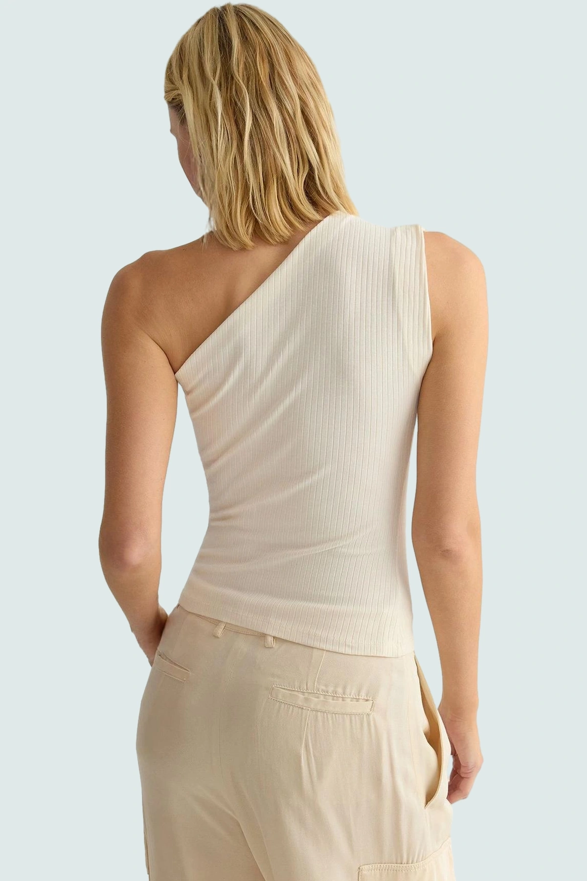Yüksek kaliteli pamuklu örme kumaştan üretilen bu kolsuz bluz, günlük stiliniz için mükemmel bir seçenek. Ekru rengi ve asimetrik yakasıyla şık ve modern bir görünüm sunar. Fitted kalıbı vücudunuza kusursuz bir şekilde otururken, regular boyu her vücut tipine uyar. Büzgü ve drape detayları ile benzersiz bir tarz oluşturur. Nefes alabilen ve yumuşak kumaşıyla gün boyu konfor sağlar. Kolay bakım gerektiren yapısıyla pratik kullanım sunar. Casual tarzınıza stil katacak bu bluz, çeşitli alt giyim parçalarıyla kombinlenebilir.
