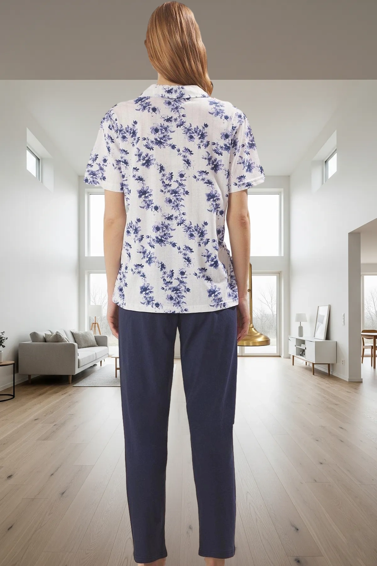 Yüksek kaliteli örme kumaştan üretilen bu pijama takımı, gün boyu konfor sağlar. Nefes alan yapısı, sıcak havalarda bile rahat hissetmenizi sağlar. Çiçek desenli üst, takıma şık bir görünüm katarken, lacivert renk ise zarif bir hava oluşturur. Regular kalıp, vücuda tam oturan, hareket kısıtlamayan rahat bir uyum sunar. Kısa kollu ve gömlek yaka üst, hem şık hem de rahattır. Boru paça alt ise modern bir görünüm sağlar.