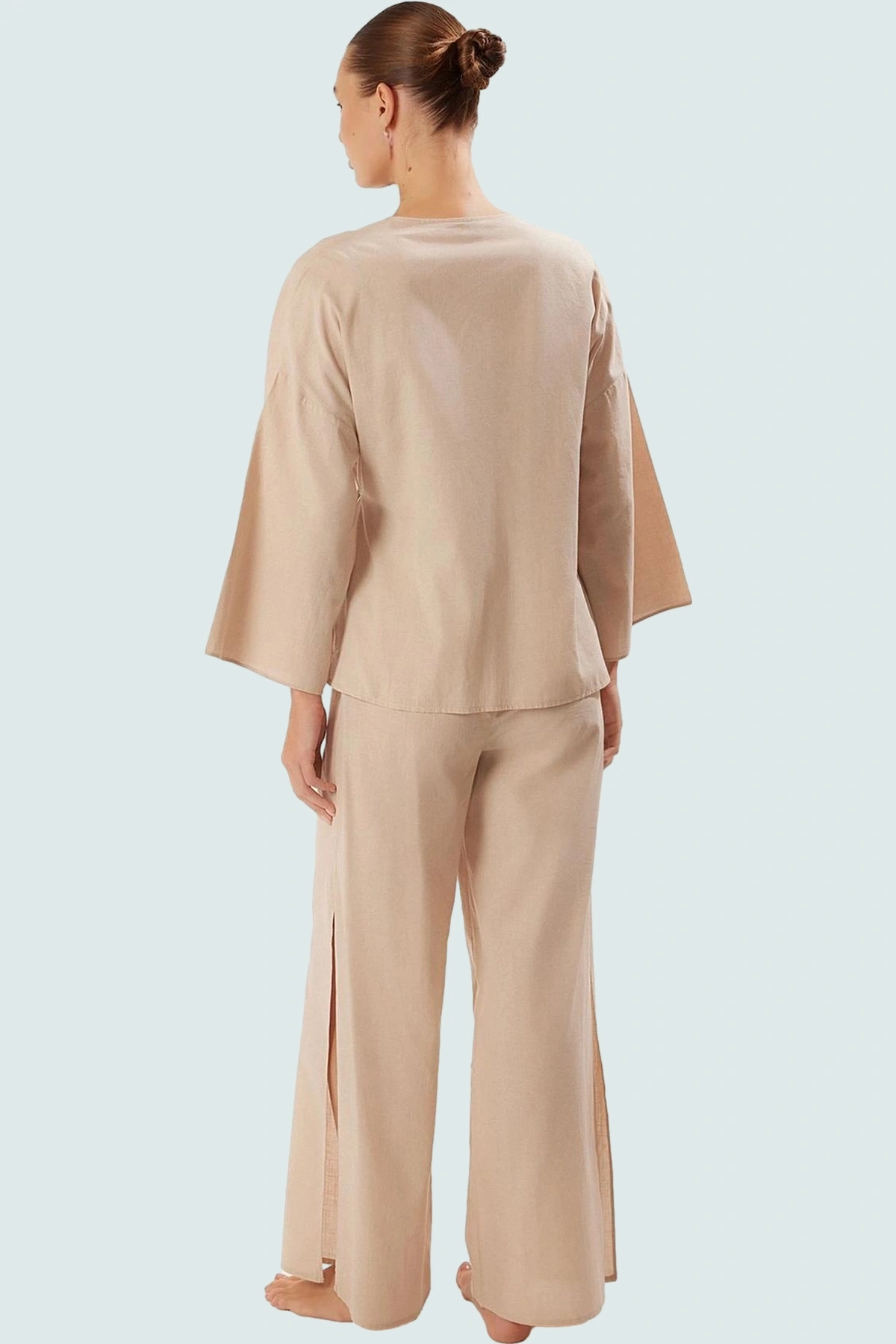 Yazın keyfini çıkarın! Bu rahat ve şık bej plaj takımı, %100 pamuktan yapılmış keten karışımlı dokuma kumaşıyla gün boyu konfor sunuyor. Gömlek üstün bağlamalı tasarımı, şık ve feminen bir stil yaratırken, uzun pantolon rahatlığı ve şıklığı bir araya getiriyor. Yanlardaki yırtmaçlar hareket kabiliyetinizi kısıtlamıyor. Modelin ölçüleri: Boy 177cm, GöğüS-83cm, BeL-63cm, Kalça 92cm. Model S-36 beden giymektedir. 35 derecede makinede yıkanabilir, kolayca bakımını yapabilirsiniz.