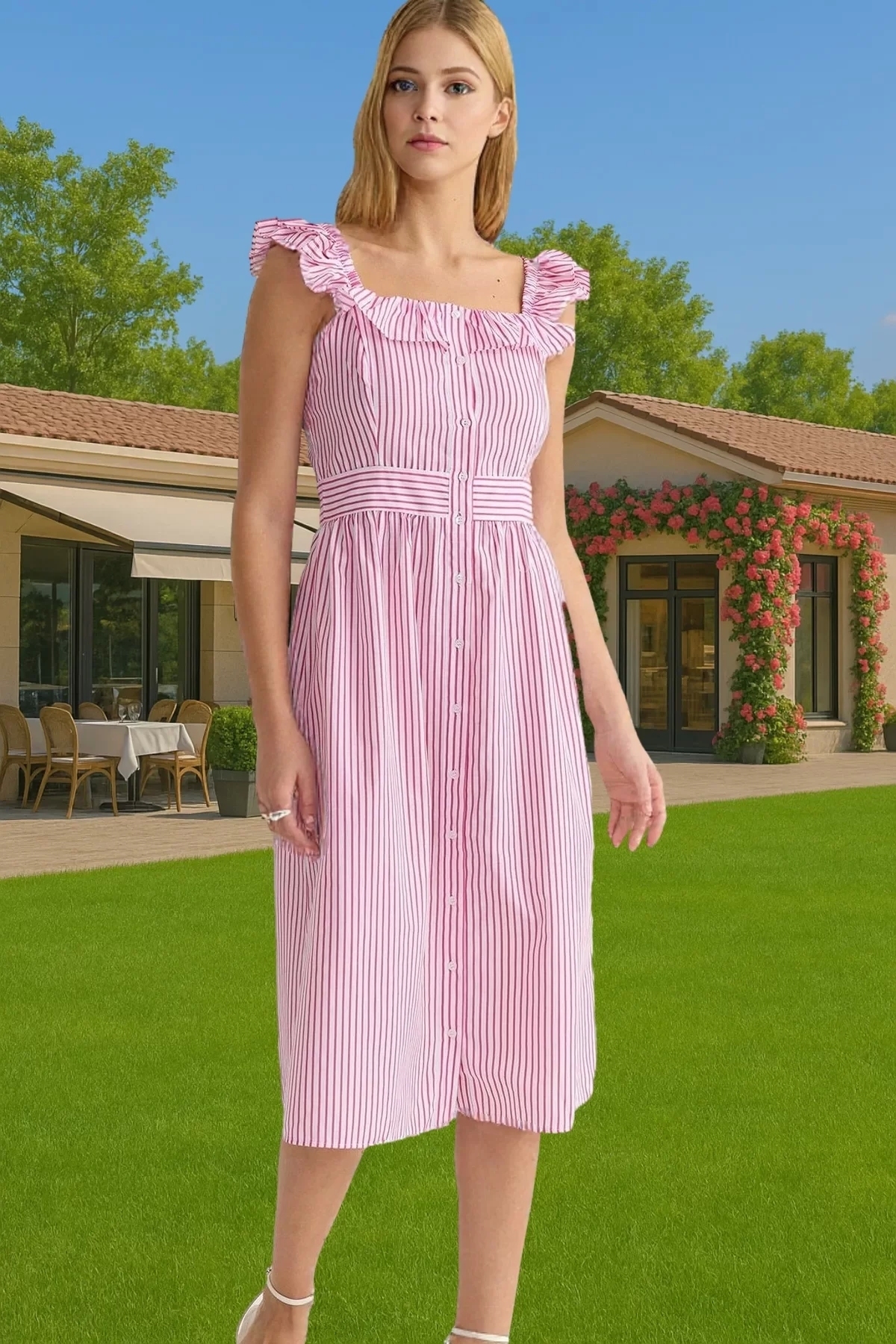 Bu yaz, kendinizi rahat ve şık hissetmenizi sağlayacak mükemmel bir elbiseyle tanışın! Pamuklu polyester karışımı kumaştan üretilen bu midi elbise, nefes alabilir yapısı ve hafif dokusuyla sıcak yaz günlerinde bile sizi serin tutacak. Şık çizgili deseni ve fırfırlı detaylarıyla göz alıcı bir görünüm sergilerken, gömlek elbise kalıbıyla rahatlığı da beraberinde getiriyor.