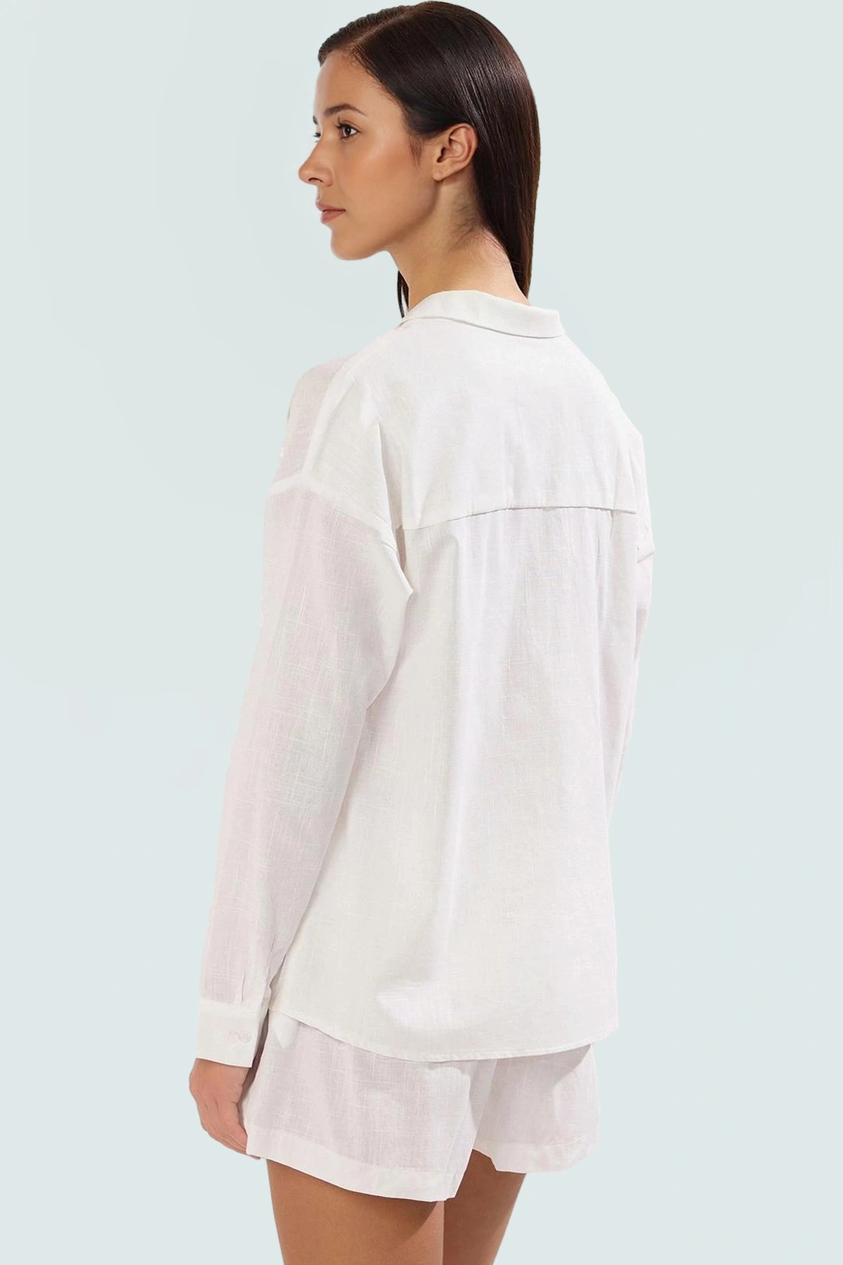 Yaz aylarının keyfini çıkarmanın en rahat yolu! Bu ekru renkli, flamlı pamuk dokuma gömlek şort takımı ile sıcak günlerde serin ve şık kalacaksınız. Yumuşak dokusuyla teninize temas eden rahatlığı hissedeceğiniz 100% pamuk kumaştan üretilmiştir. Plajda, havuz başında veya günlük kullanım için ideal olan bu takım, hem rahatlığı hem de şıklığı bir araya getiriyor.