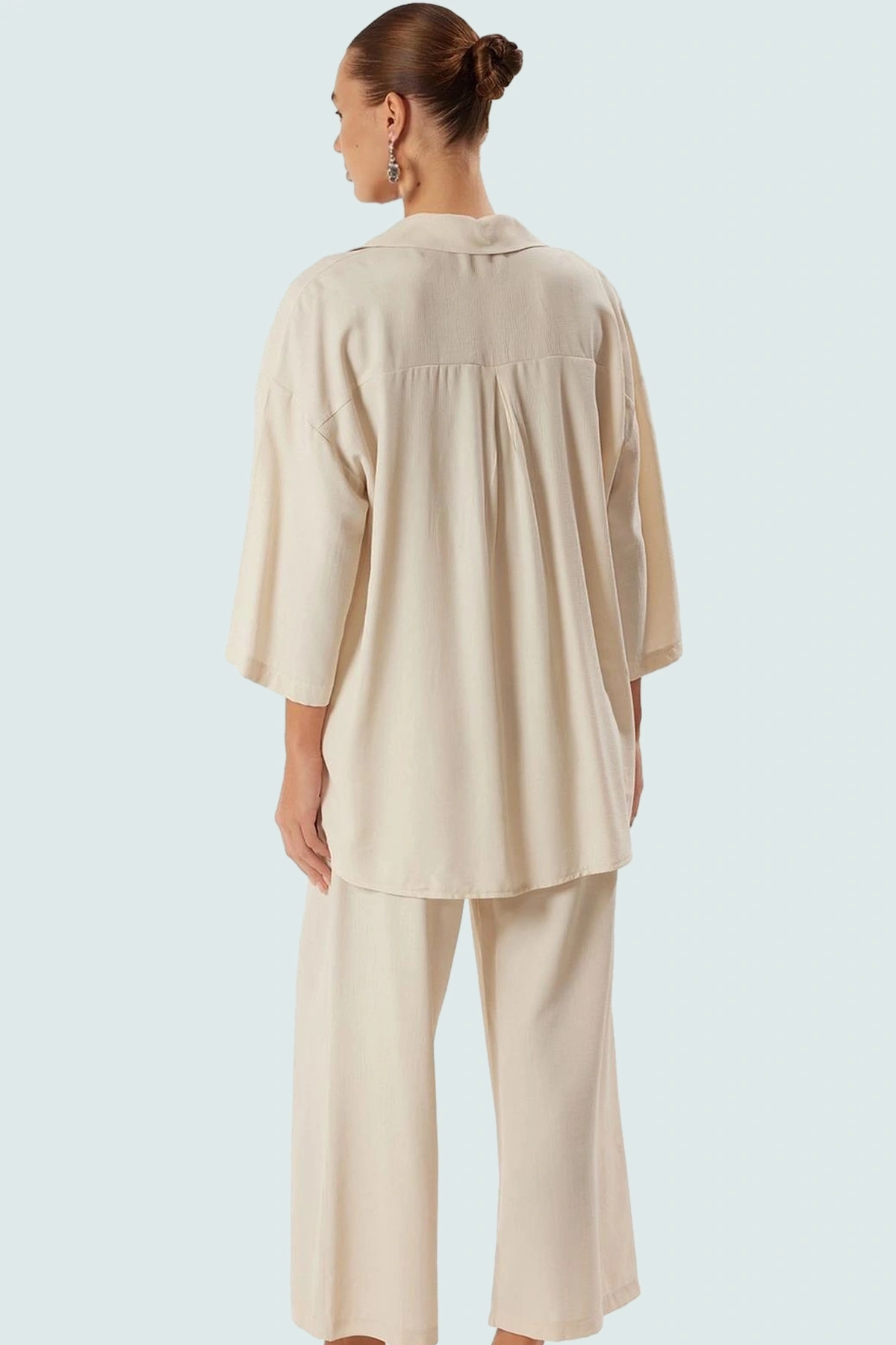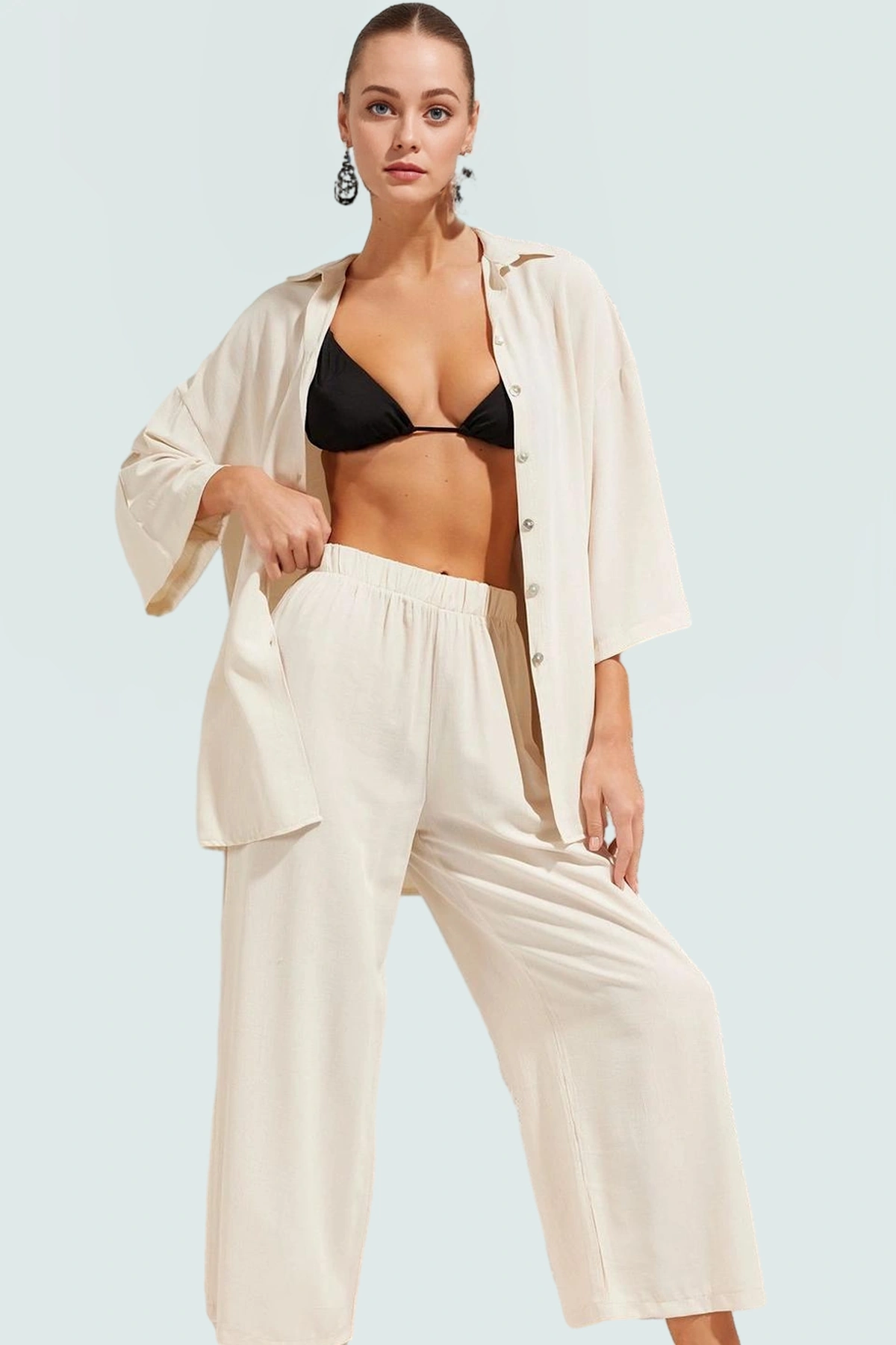 Yazın keyfini çıkarırken şık ve rahat hissetmek ister misiniz? Bu ekru renkli, viskoz ve polyester karışımı dokumasıyla hafif ve nefes alabilir plaj takımı tam size göre! Gömlek ve pantolonun uzun ve geniş kesimleri sizi bunaltmayacak, özgür hareket etmenizi sağlayacak. Düz desen ve gömlek yakasıyla sade ama şık bir görünüm sunan bu takım, her vücut tipine mükemmel uyum sağlar. Plajda, havuz başında veya günlük yaşamda rahatlıkla kullanabilirsiniz.