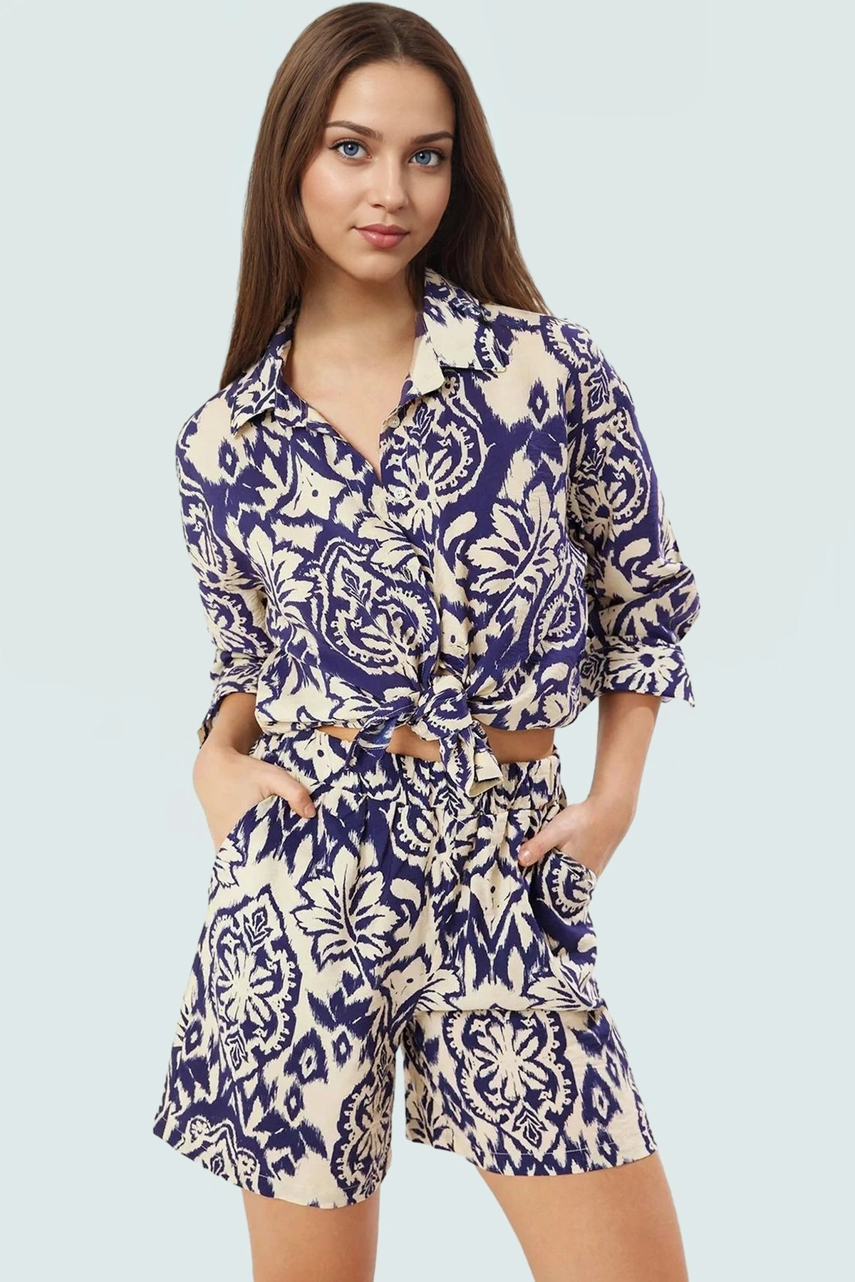 Viskoz ve poliamid karışımı kumaş, dayanıklı ve kolay bakımıyla uzun yıllar kullanım sağlar. Yüksek bel şort, vücut hatlarınızı en güzel şekilde ortaya koyarken, düşük kol gömleği ise rahatlık ve şıklığı bir arada sunar. Tamamen düğme detaylı kapama sistemi, kullanımı kolaylaştırır. Dokuma tipi Shally olan kumaş, hafif ve nefes alabilir özelliğiyle yaz günlerinde serin kalmanıza yardımcı olur.