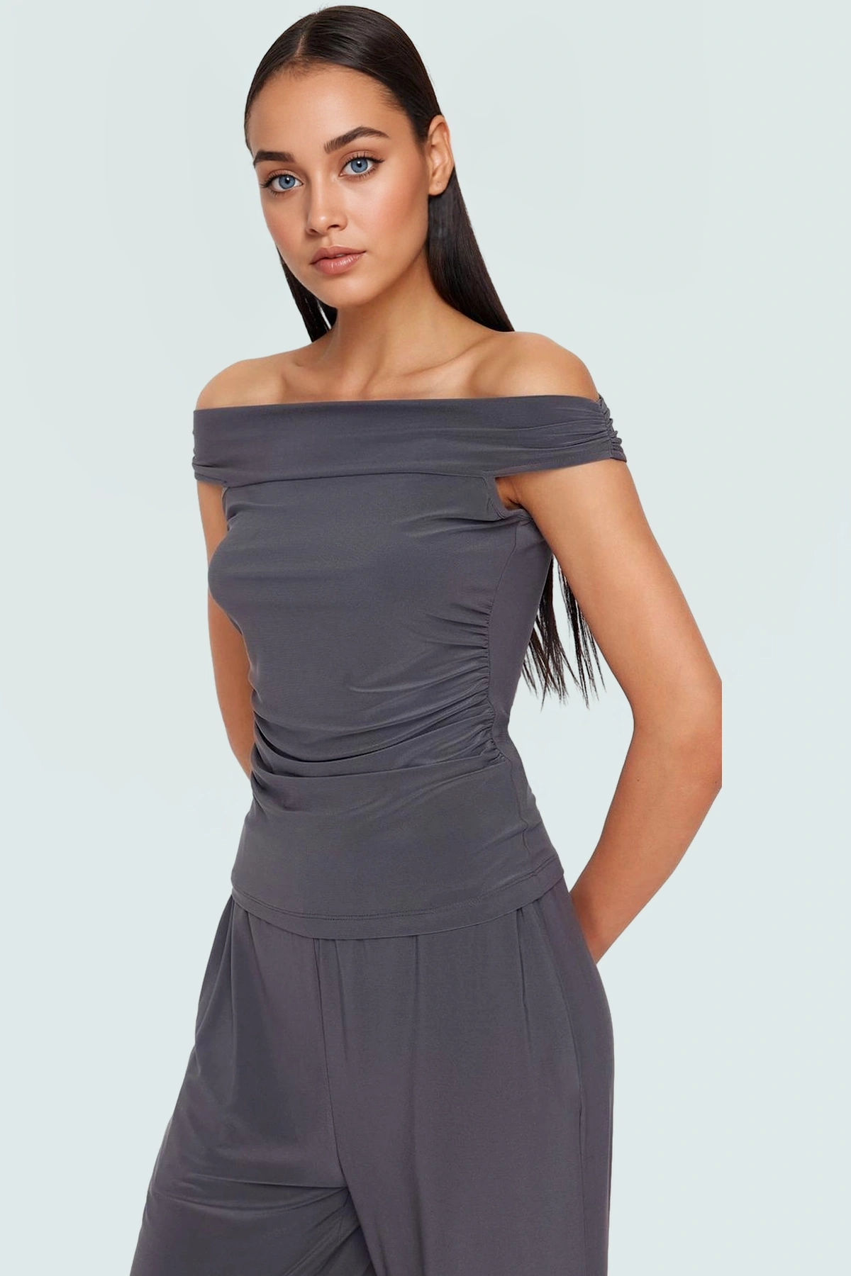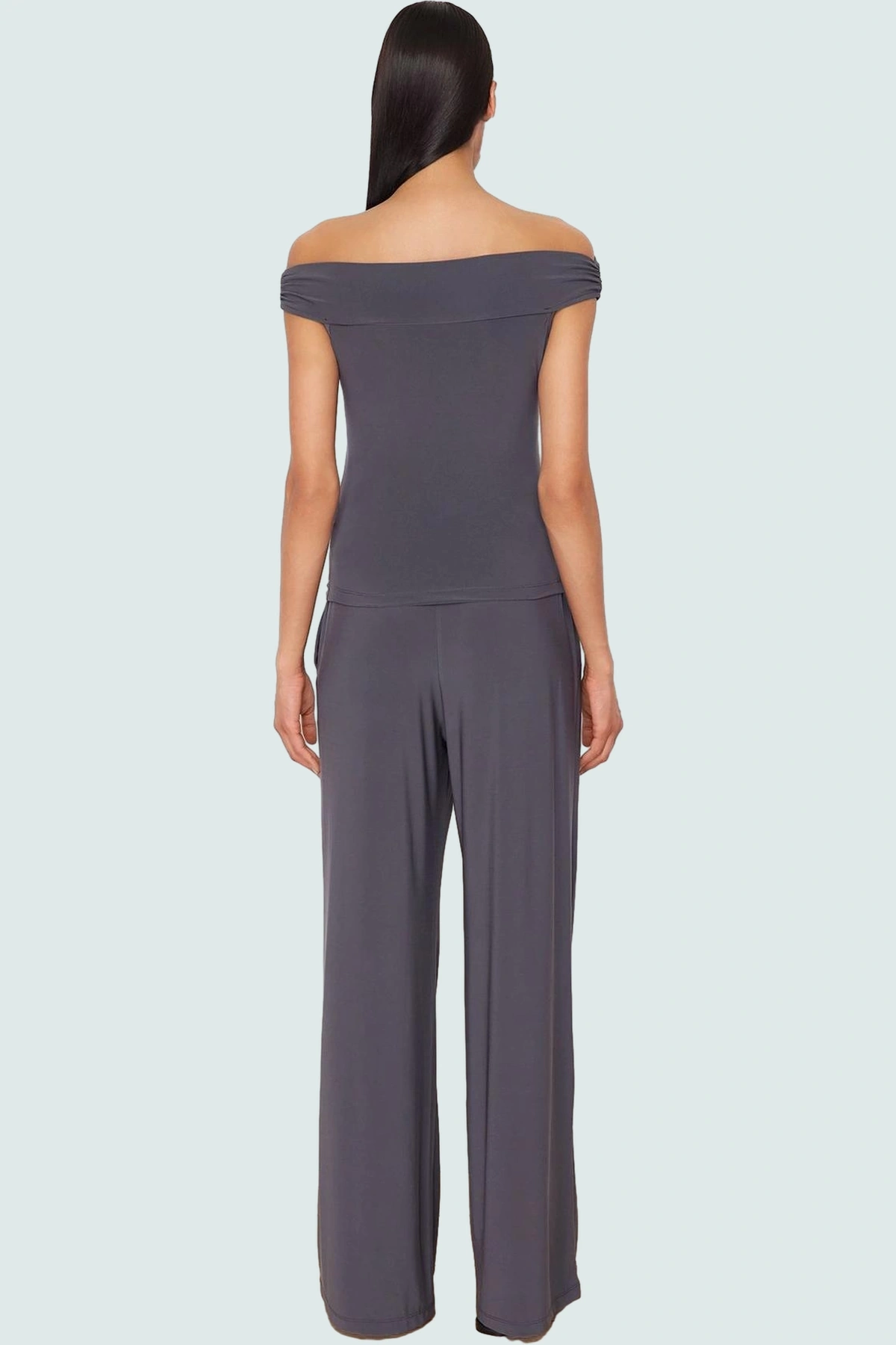 Rahat ve Şık Örme Bluz Pantolon Takım Carmen Yaka Geniş Paça Uzun Boy Mükemmel Uyum