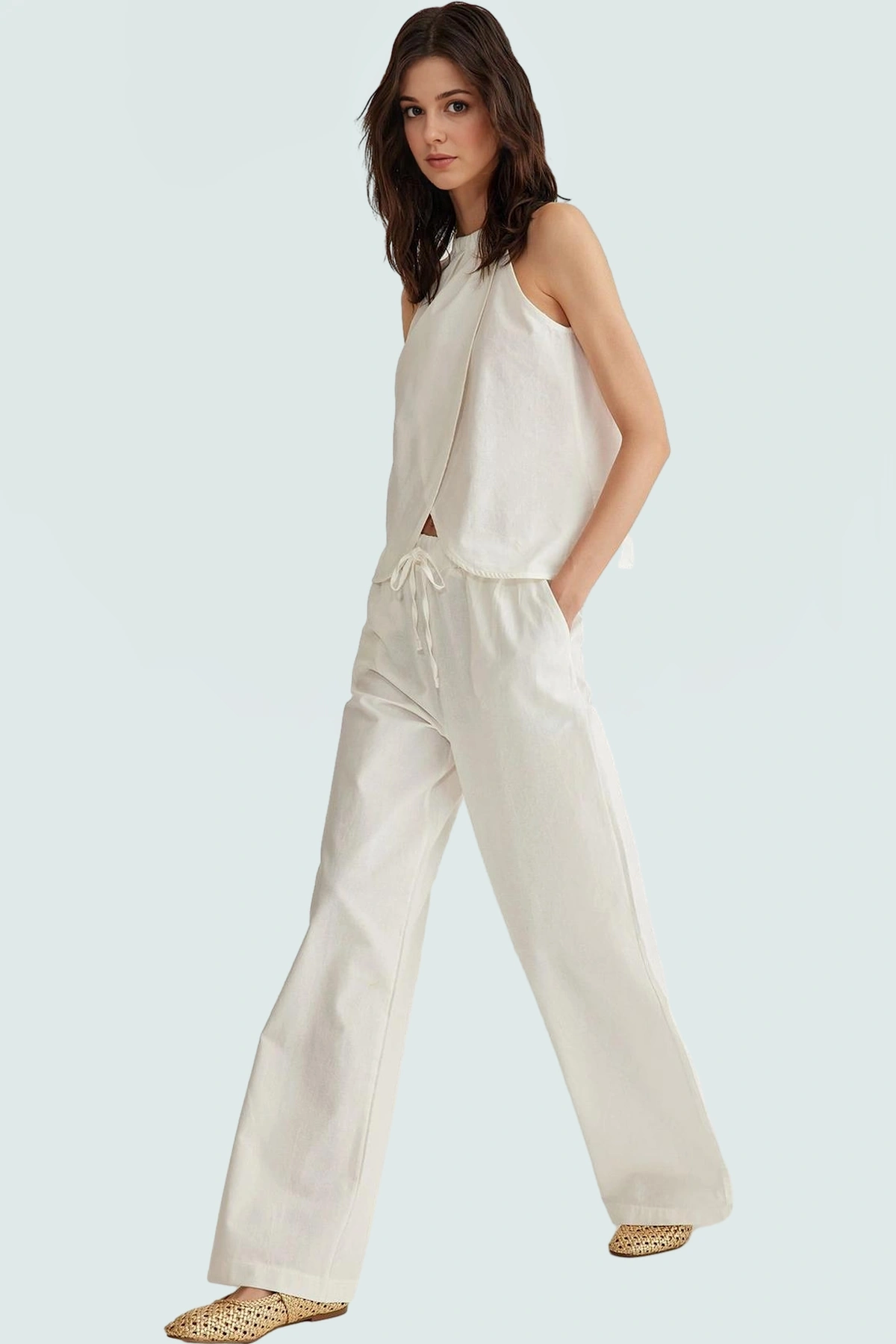 Bu şık ve rahat takımı, farklı aksesuarlarla kombinleyerek kendi tarzınızı yaratabilirsiniz. Hasır bir çanta, şık bir şapka ve düz sandaletlerle, yaz günlerinde hem rahat hem de şık görünebilirsiniz. İş için, günlük hayatta veya özel günlerde; bu takım her zaman mükemmel bir seçim olacaktır. Kombinasyon seçeneklerinin fazla olmasıyla, farklı ortamlarda rahatlıkla kullanabilirsiniz.
