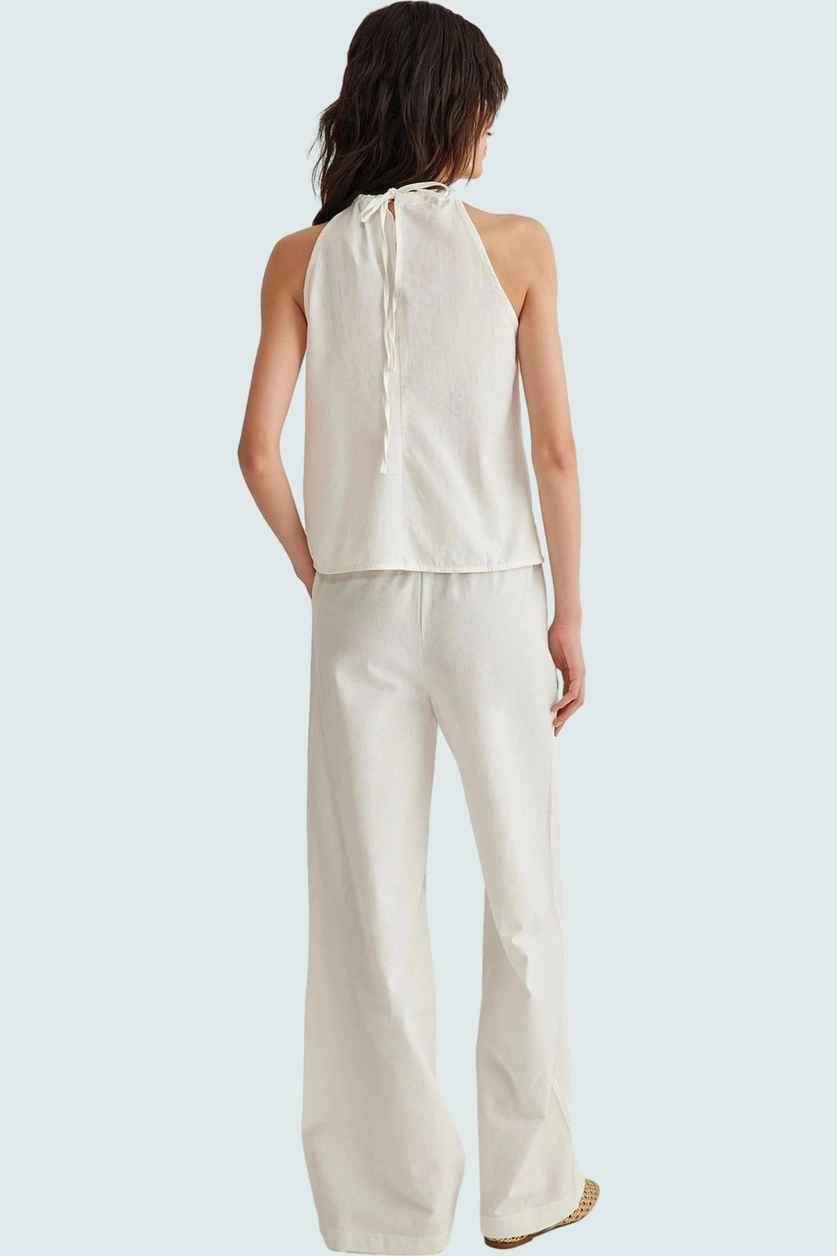 Yaz sıcağında hem rahat hem de şık görünmek mi istiyorsunuz? Bu ekru renkli pamuklu takım tam size göre! Nefes alan pamuk kumaştan üretilen bu rahat takım, gün boyu konfor sağlar. Halter yakalı bluz ve geniş paça pantolon, modern ve feminen bir stil sunarken, regular kalıbı her vücut tipine mükemmel uyum sağlar. Yumuşak dokusu teninizde harika bir his bırakacak.
