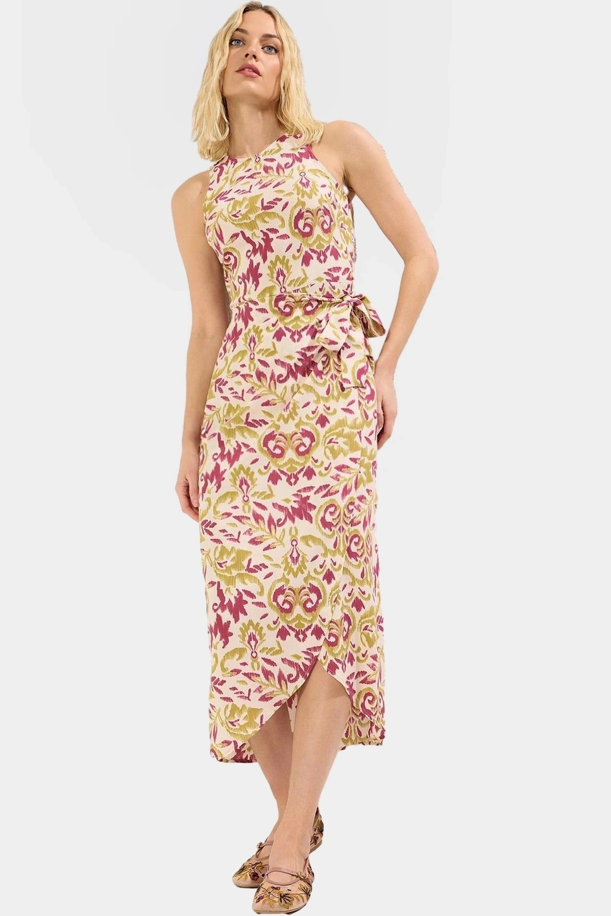Nefes alan 100% viskoz kumaştan üretilen bu midi elbise, yaz aylarında rahatlık ve şıklığı bir arada sunar. Şal desenli tasarımıyla dikkat çeken elbise, A kesim kalıbıyla her vücut tipine mükemmel uyum sağlar. Bisiklet yakası ve kolsuz tasarımıyla modern ve feminen bir görünüm yaratır. Günlük kullanım için ideal olan bu elbise, rahatlığı ve şıklığı bir araya getiren mükemmel bir seçenektir. Cepsiz tasarımıyla minimal bir tarz sunar.