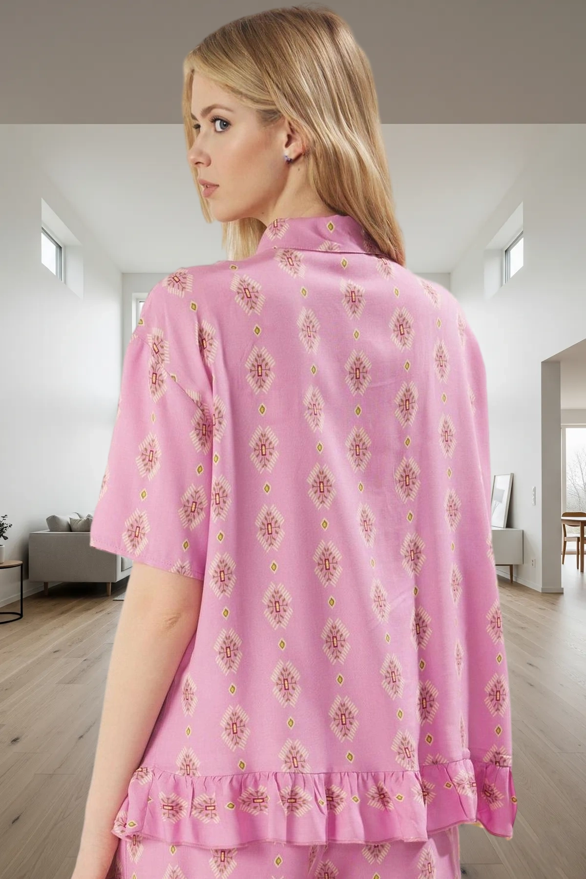 Bu pijama takımı, günlük yaşamınızda rahatlığı ve tarzı bir araya getirmek isteyenler için ideal bir seçimdir. Nefes alan viskon kumaş, mükemmel konfor sunar. Etnik desenler ise takımınıza şık bir hava katar. Fırfırlı detaylar, şorta romantik bir dokunuş katarken, gömlek yakası ise zarif bir görünüm sağlar. Boru paça şortlar ise hem şık hem de rahattır. Evde rahat vakit geçirmek veya misafir ağırlamak için mükemmel olan bu takım, gün boyu keyifli hissetmenizi sağlayacak.
