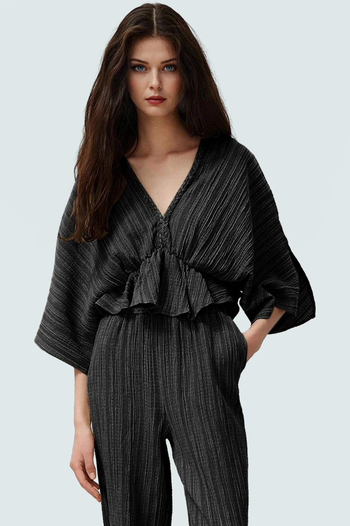 Yazlık şıklığınıza modern bir dokunuş katacak Ekru Bluzumuz, keten karışımlı dokusuyla benzersiz bir konfor sunuyor. V yakası ve kısa kollarıyla hem şık hem de pratik olan bu bluz, regular kalıbıyla vücudunuza mükemmel uyum sağlar. Nefes alabilen, hafif kumaşıyla sıcak yaz günlerinde bile serin kalmanıza yardımcı olur. Dayanıklı ve uzun ömürlü yapısı ile uzun yıllar boyunca gardrobunuzda yerini koruyacak. Makinede yıkama özelliği ile kolay bakım imkanı sunar. Casual veya günlük kombinlerinizde rahatlıkla kullanabilirsiniz. Şıklığı ve rahatlığı bir arada arayanlar için ideal bir seçimdir. Şık ve rahat bir tarz arayan modern kadınlar için tasarlanmıştır. Günlük kullanım için idealdir, plaj kombinlerinize de uyum sağlar. Kot şort, beyaz pantolon veya etek ile mükemmel bir uyum yakalar. Her vücut tipine uygun regular kesim, hareket özgürlüğü sunar.