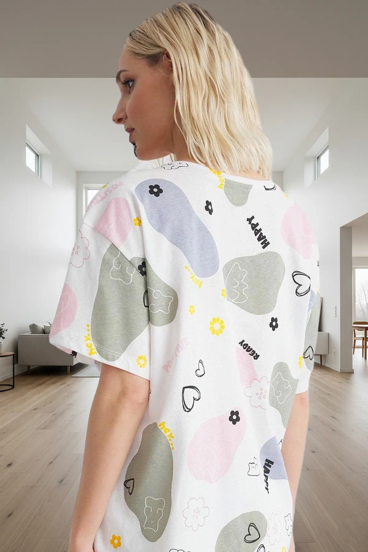 Yaz aylarının vazgeçilmez parçası olacak bu pijama takımı, kısa kollu tişört ve rahat şorttan oluşur. Normal beli ve regular kalıbıyla her vücut tipine uyum sağlarken, eğlenceli baskılarıyla da tarzınızı yansıtır. 36-44 beden aralığında bulunan bu takım, her bedende mükemmel bir uyum sağlar. Evde rahatlamak, uyumak veya günlük aktivitelerinizde kullanabileceğiniz bu pijama takımı, konfor ve şıklığı bir arada sunar.