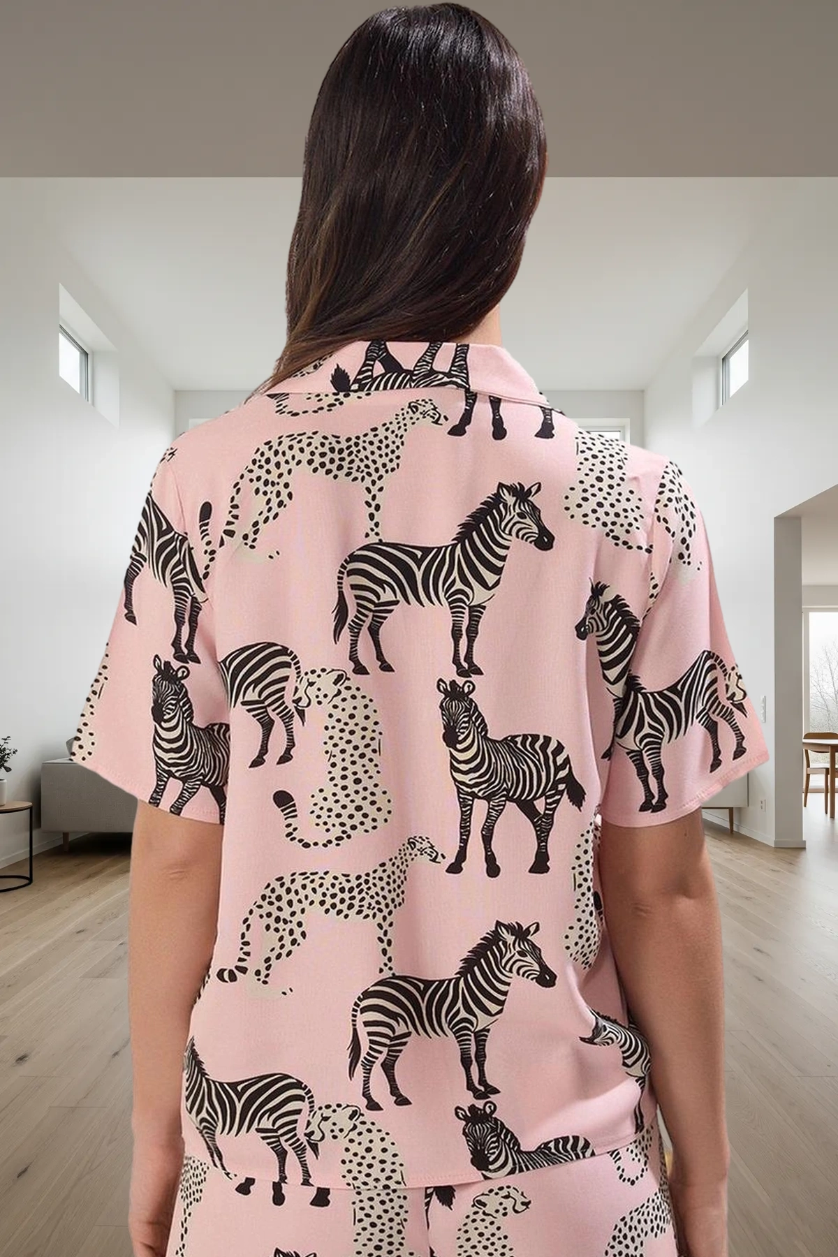 Yaz gecelerini serin ve rahat geçirmek için mükemmel bir seçim olan bu pijama takımı, %100 viskon kumaştan üretilmiştir. Yumuşak ve nefes alan yapısıyla cildinizi rahatsız etmez, uyku kalitenizi artırır. Pembe rengi ve hayvan desenli tasarımı ile şık ve modern bir görünüm sunar, kendinizi özel hissetmenizi sağlar. Kısa kollu gömlek ve şorttan oluşan takım, pratik ve kullanışlıdır.