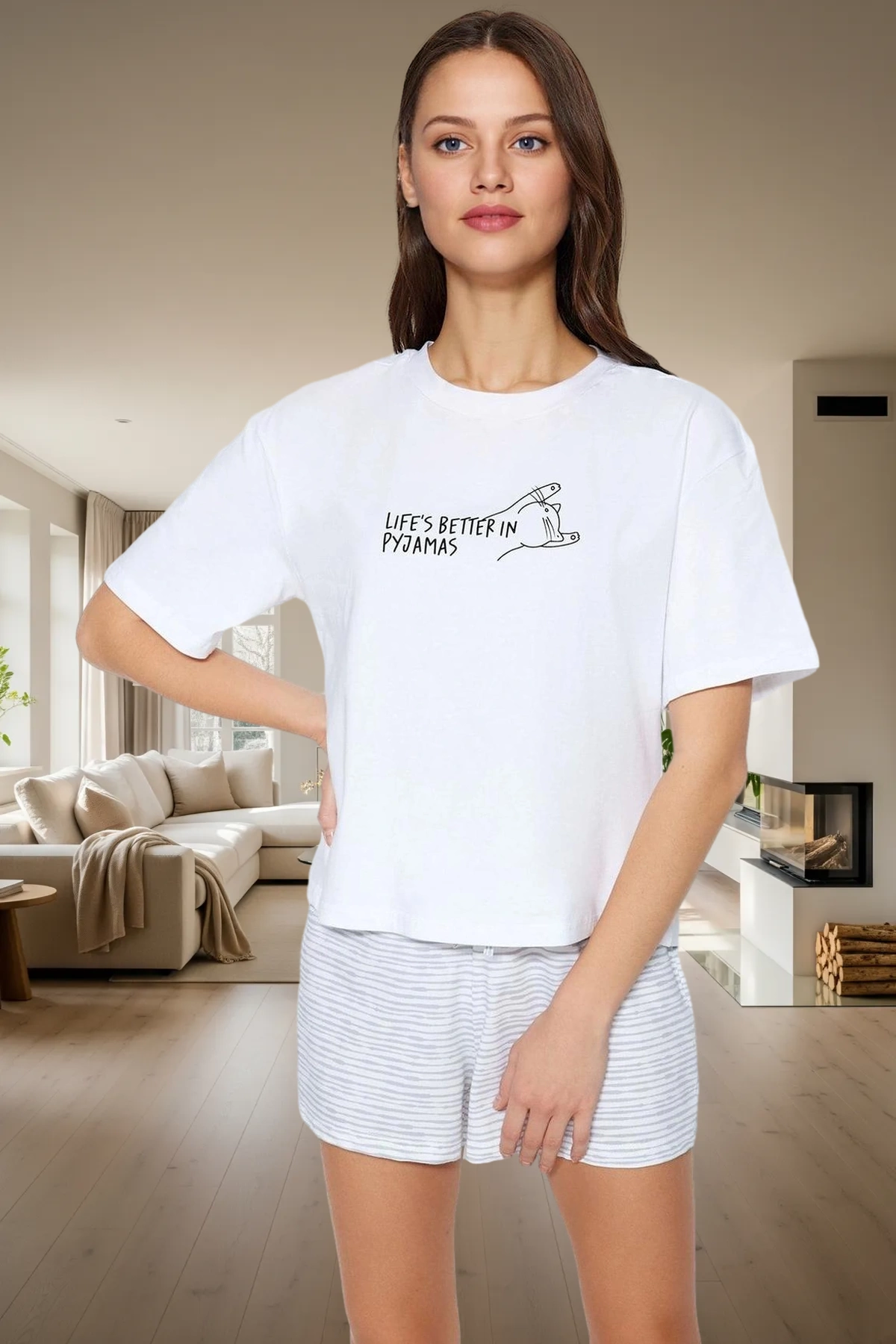 Evde rahatlığın tadını çıkarın! Bu pijama takımı, %96 pamuk ve %4 elastan karışımıyla üretilen yumuşak örme kumaşıyla gün boyu süren konfor sunuyor. Çizgili deseni ve beyaz rengi ile şık bir görünüm kazandırırken, kısa kollu tişört ve şort tasarımıyla sıcak yaz gecelerinde serin kalmanıza yardımcı olur. Regular kalıbı sayesinde vücudunuza tam oturur ve hareket özgürlüğü sağlar. Normal bel yapısıyla da rahat bir kullanım deneyimi sunar. Mix baskı tekniğiyle işlenmiş ‘Life’s Better in Pyjamas’ sloganı ise eğlenceli bir detay.