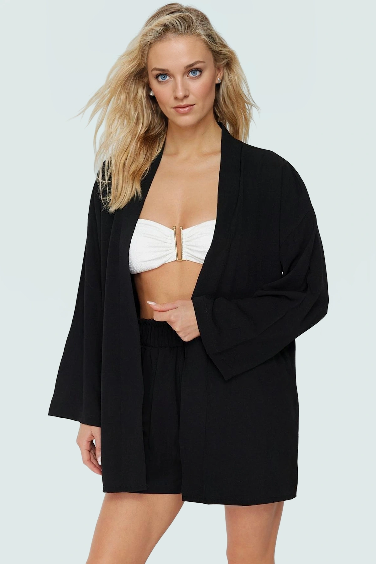 Model (Boy:174cm, Göğüs:88cm, Bel:59cm, Kalça:88cm) S/36 beden ürünü giymektedir. Bu şort takım, plaj günleriniz için idealdir, ancak günlük hayatta da şık bir alternatiftir. Topuklu ayakkabılarla veya spor ayakkabılarla kombinleyerek farklı stiller yaratabilirsiniz. Rahatlığı ve tarzı birleştirerek, yaz aylarını stil sahibi ve konforlu bir şekilde geçirin.