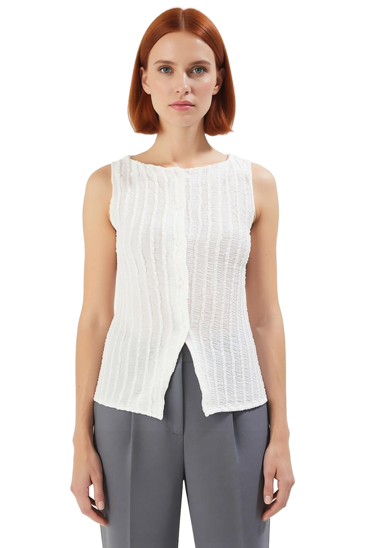 Rahatlığı ve şıklığı bir arada arayanlar için ideal bir seçenek olan bu ekru bluz, yaz aylarının sıcak günlerinde bile sizi serin ve şık tutacak. Nefes alan, yumuşak gofre örme kumaştan üretilen bluz, gün boyu konfor sunuyor. Kayık yakası ve regular boyu ile her vücut tipine uyum sağlayan bluz, gardırobunuzda çok yönlü bir parça olacak.