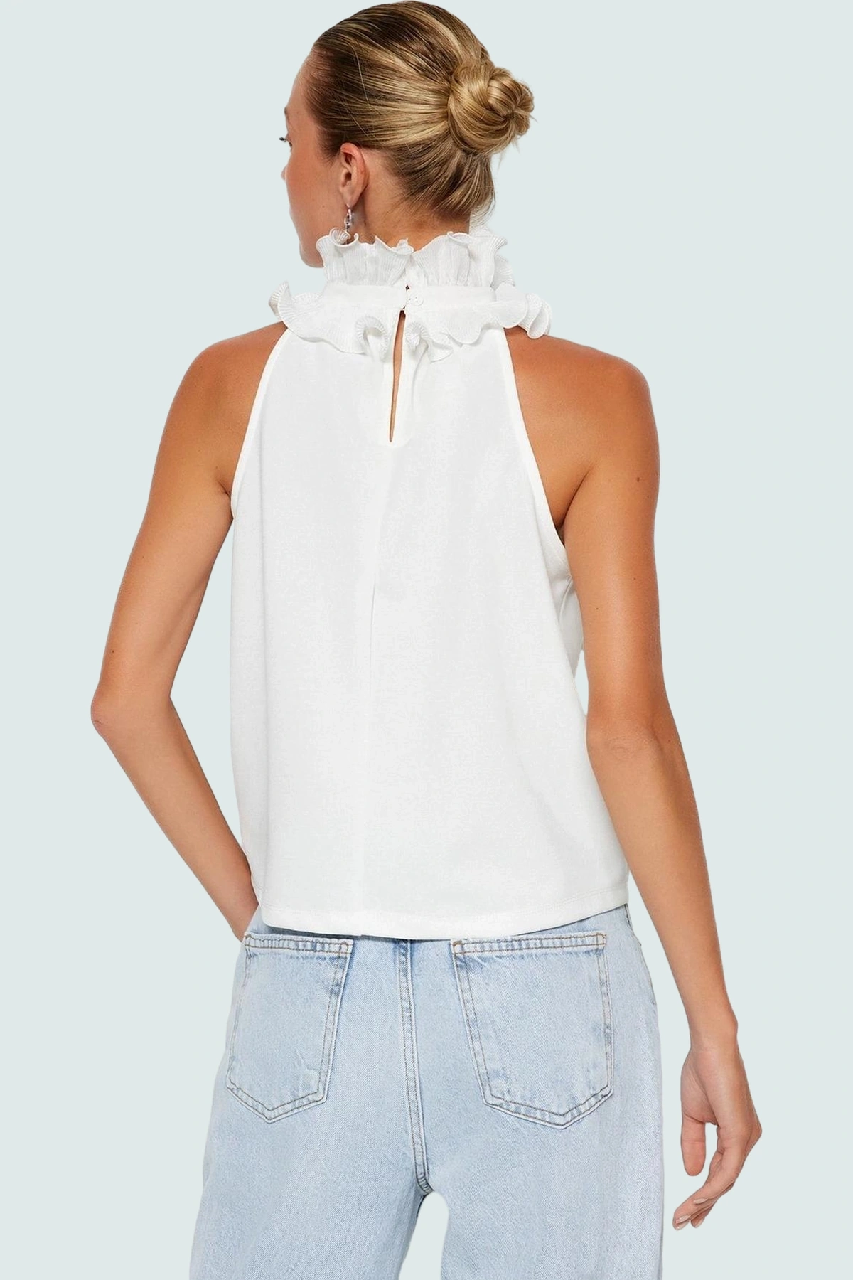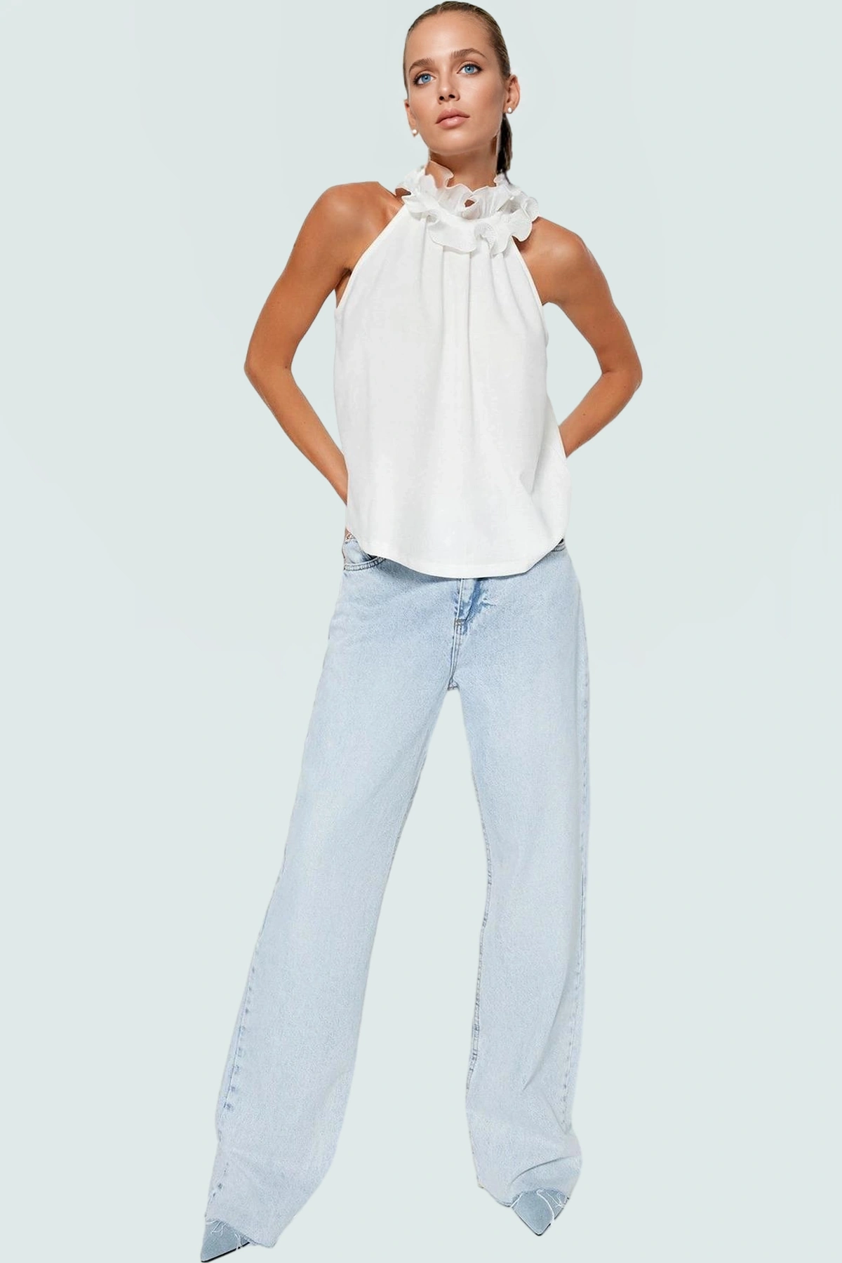Günlük şıklığınıza modern bir dokunuş katacak bu ekru bluz, yüksek kaliteli polyester örme kumaştan üretilmiştir. Regular kalıbıyla vücuda mükemmel oturan bluz, kolsuz tasarımıyla yaz aylarında serin kalmanıza yardımcı olur. Halter yaka ve fırfırlı detaylarıyla feminen bir hava katarak tarzınızı ön plana çıkarır. Her mevsim giyebileceğiniz bu bluz, gardırobunuzun en çok kullanılan parçalarından biri olacaktır.