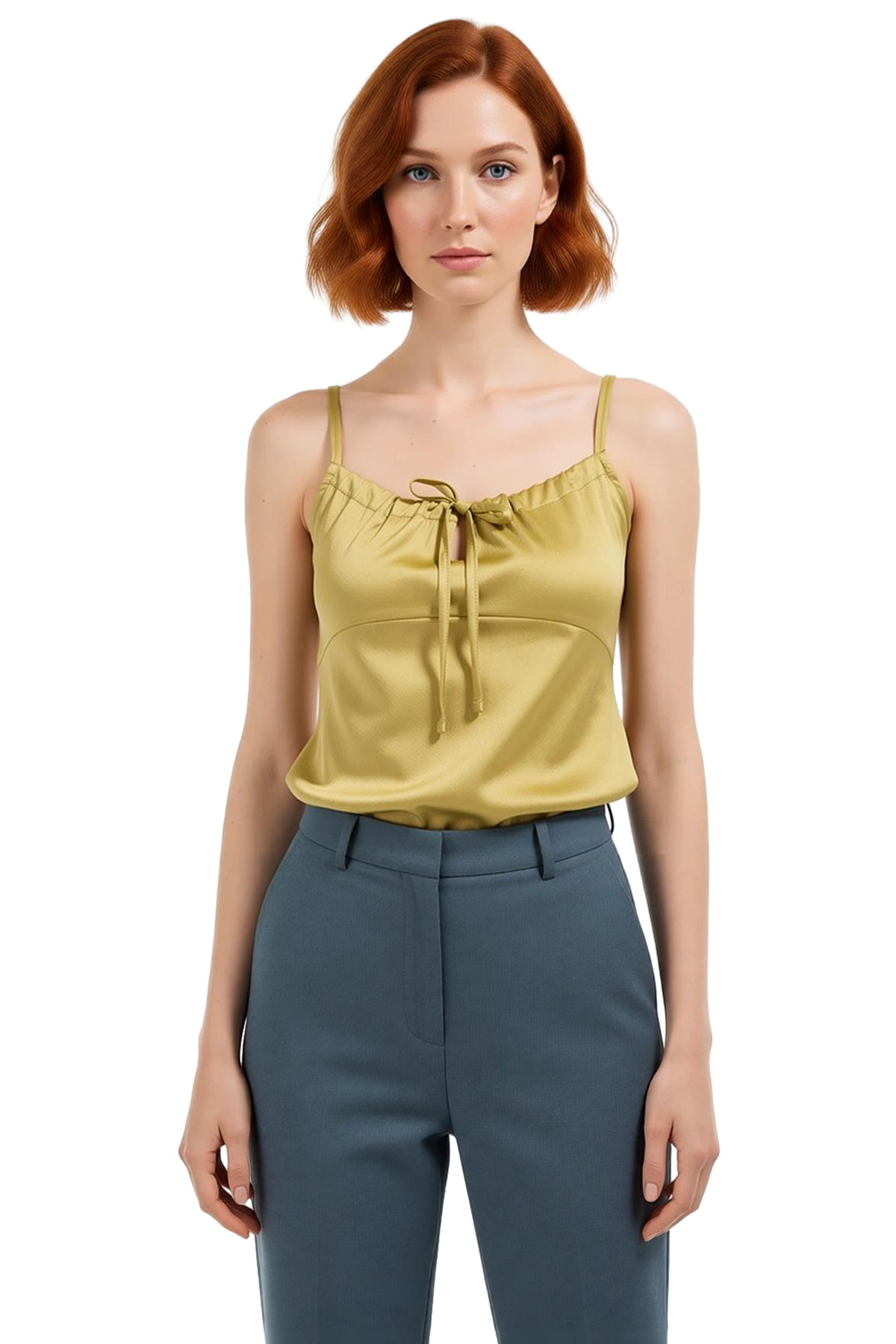 Günlük şıklığınız için mükemmel bir seçim olan bu kolsuz bluz, yumuşak saten dokusuyla teninize değdiği anda sizi kendine hayran bırakacak. Regular kalıbıyla her vücut tipine uyum sağlayan bluz, ince askılarıyla rahat bir kullanım sunuyor. Parlak yeşil rengi, enerjik tarzınıza canlılık katarken, kalp yaka detayı feminen bir dokunuş ekliyor. Bu yaz, şıklıktan ve konfordan ödün vermeden günlerinizi geçirin.
