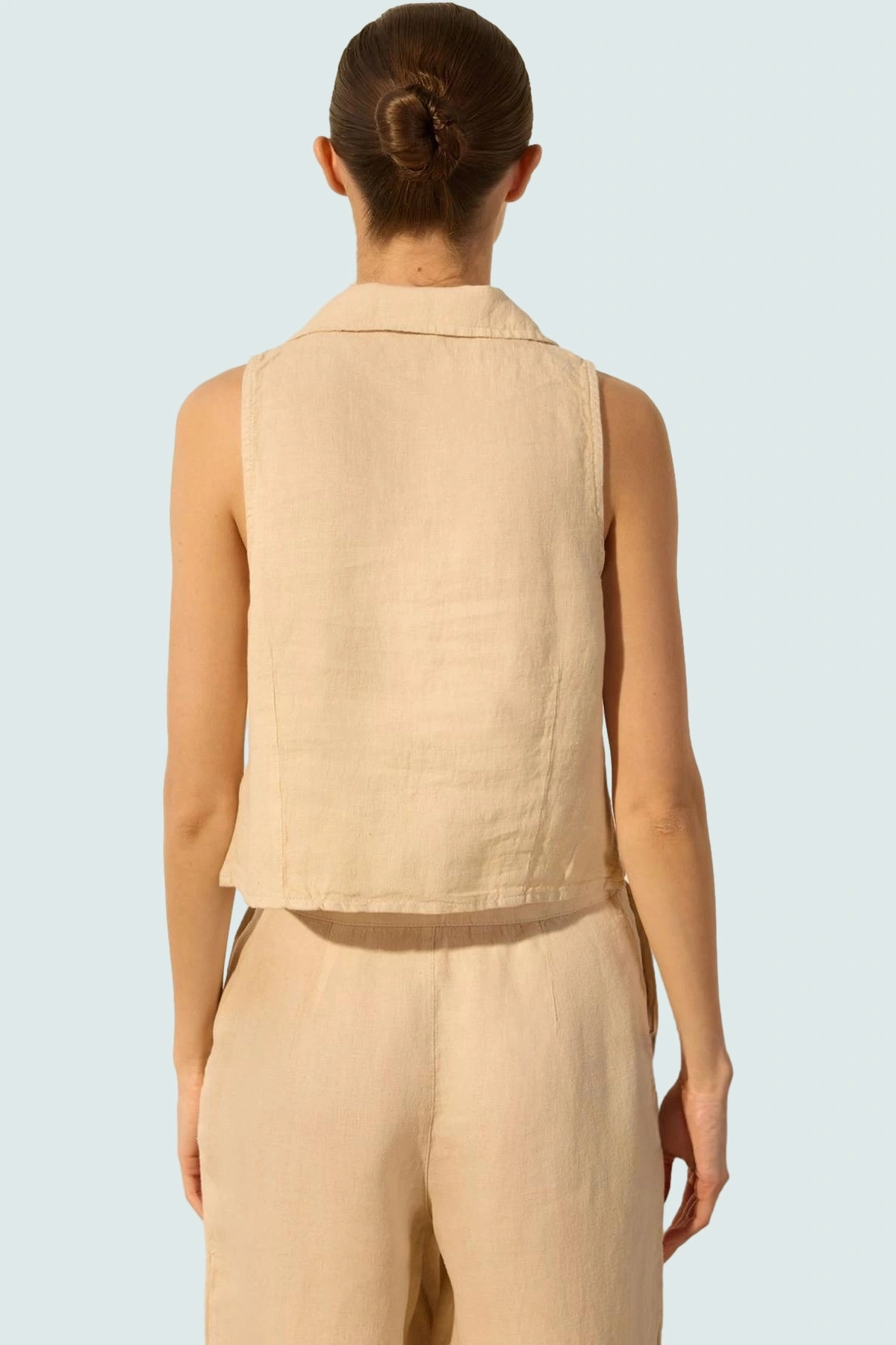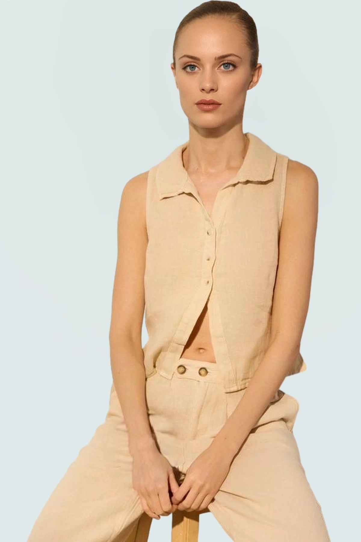 Yüksek kaliteli keten kumaşı, dayanıklı ve uzun ömürlü bir kullanım sunar. Düzenli yıkamaya rağmen şeklini ve rengini koruyarak size uzun yıllar hizmet eder. Dik yakası, bluza şık ve zarif bir hava katarak farklı kombinler yaratmanıza olanak tanır. Kolsuz tasarımı sıcak havalarda serin kalmanıza yardımcı olurken, aynı zamanda hareket özgürlüğünüzü kısıtlamaz. Cepsiz tasarımıyla minimalist bir görünümü benimser, fazla detay olmadan şıklığını konuşturur.