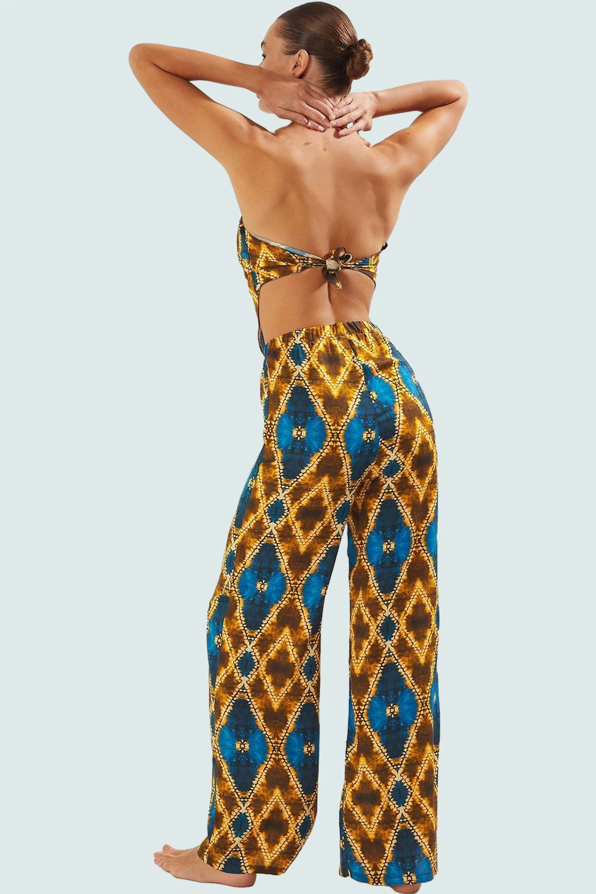 Plaj stilinizi tamamlayacak göz alıcı bir tasarım! Bu kolsuz bluz pantolon takımı, yazın sıcak günlerinde serin ve şık kalmanızı sağlayacak. 100% viskoz kumaştan üretilen takım, nefes alan yapısıyla gün boyu konfor sunuyor. Çarpıcı şal deseni ise, plaj veya havuz kenarında tarzınızı konuşturmanıza yardımcı olacak.