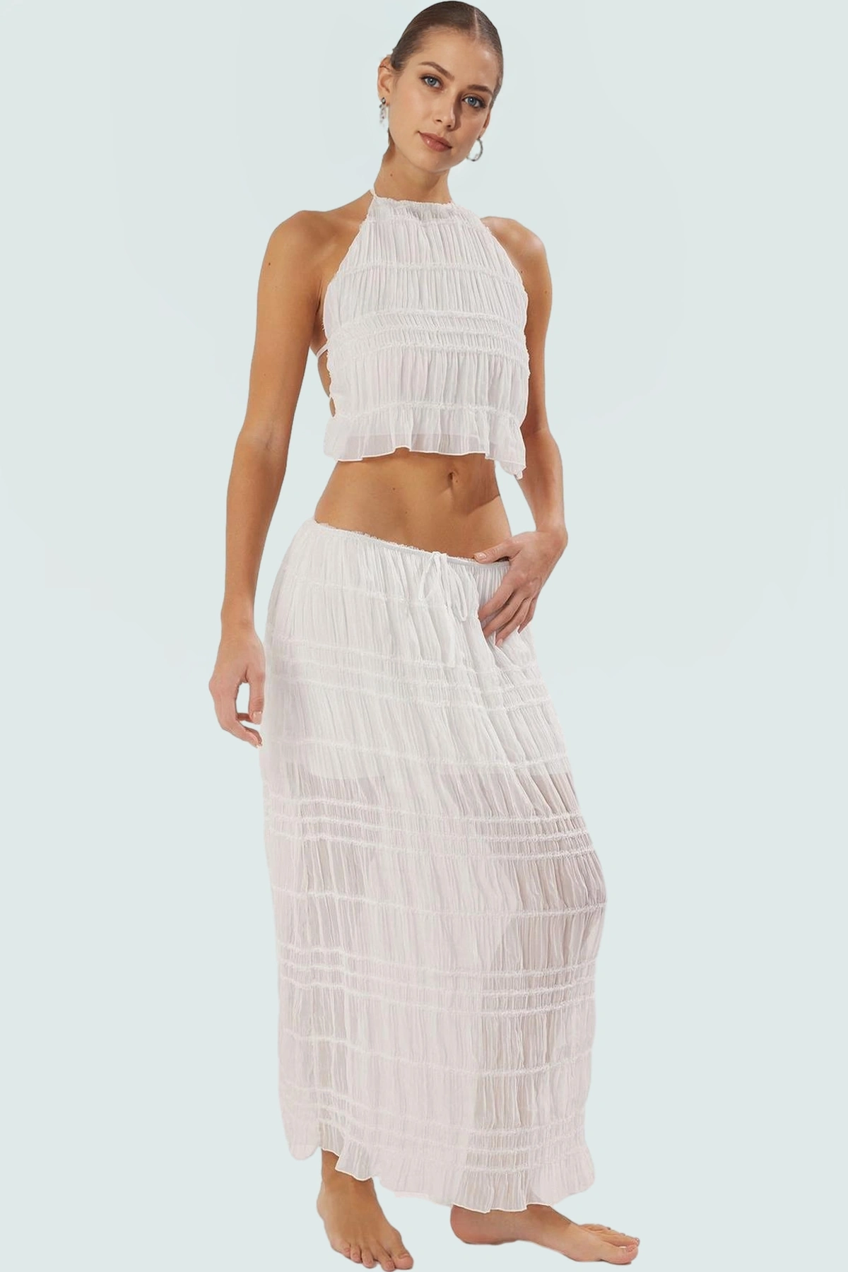 Bu yazın en şık ve rahat plaj kombinini sunuyoruz! Ekru renkli, ince askılı şifon bluz ve uzun eteğin mükemmel uyumu ile kendinizi özel hissedeceksiniz. Hafif ve nefes alan şifon kumaş, yaz sıcağında sizi serin ve konforlu tutarken, rahat kesimiyle hareket özgürlüğünüzü kısıtlamaz.