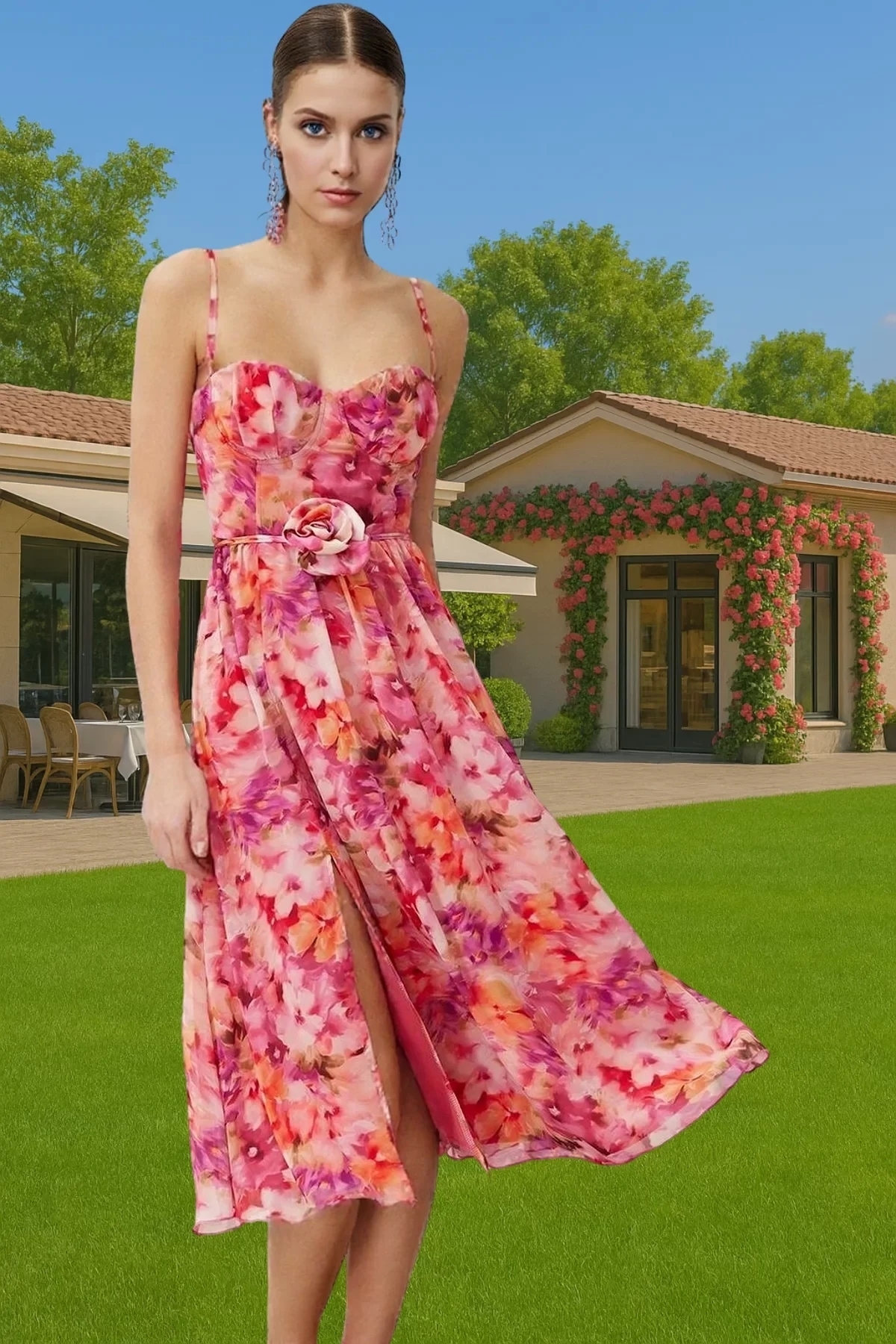 Bu büyüleyici A-kesim elbiseyle, özel günlerinizde kendinizi prenses gibi hissedeceksiniz. Hafif ve akıcı şifon kumaşın zarafeti, canlı çiçek desenleriyle birleşerek göz alıcı bir stil oluşturuyor. Kalp yaka ve ince askılar, feminenliğinizi vurgularken, beldeki zarif gül detayı, silüetinize mükemmel bir şekilde uyum sağlıyor.