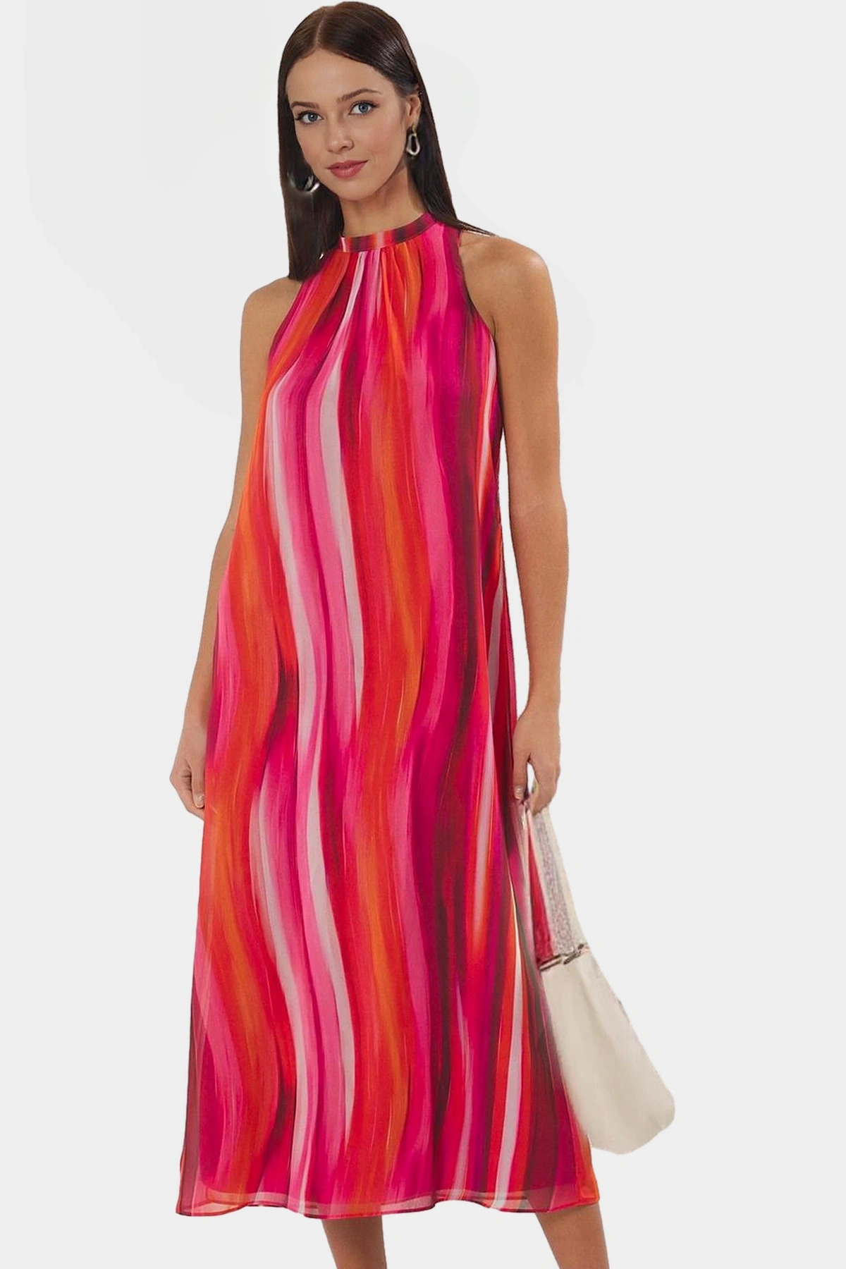 Bu muhteşem pembe elbiseyle yazın enerjisini üzerinizde taşıyın! Hafif ve akıcı şifon kumaşıyla gün boyu rahatlık sunan elbise, soyut desenleriyle de göz alıcı bir tarz yaratıyor. Dik yakası ve relaxed kalıbıyla hem şık hem de rahat bir görünüm elde edersiniz.