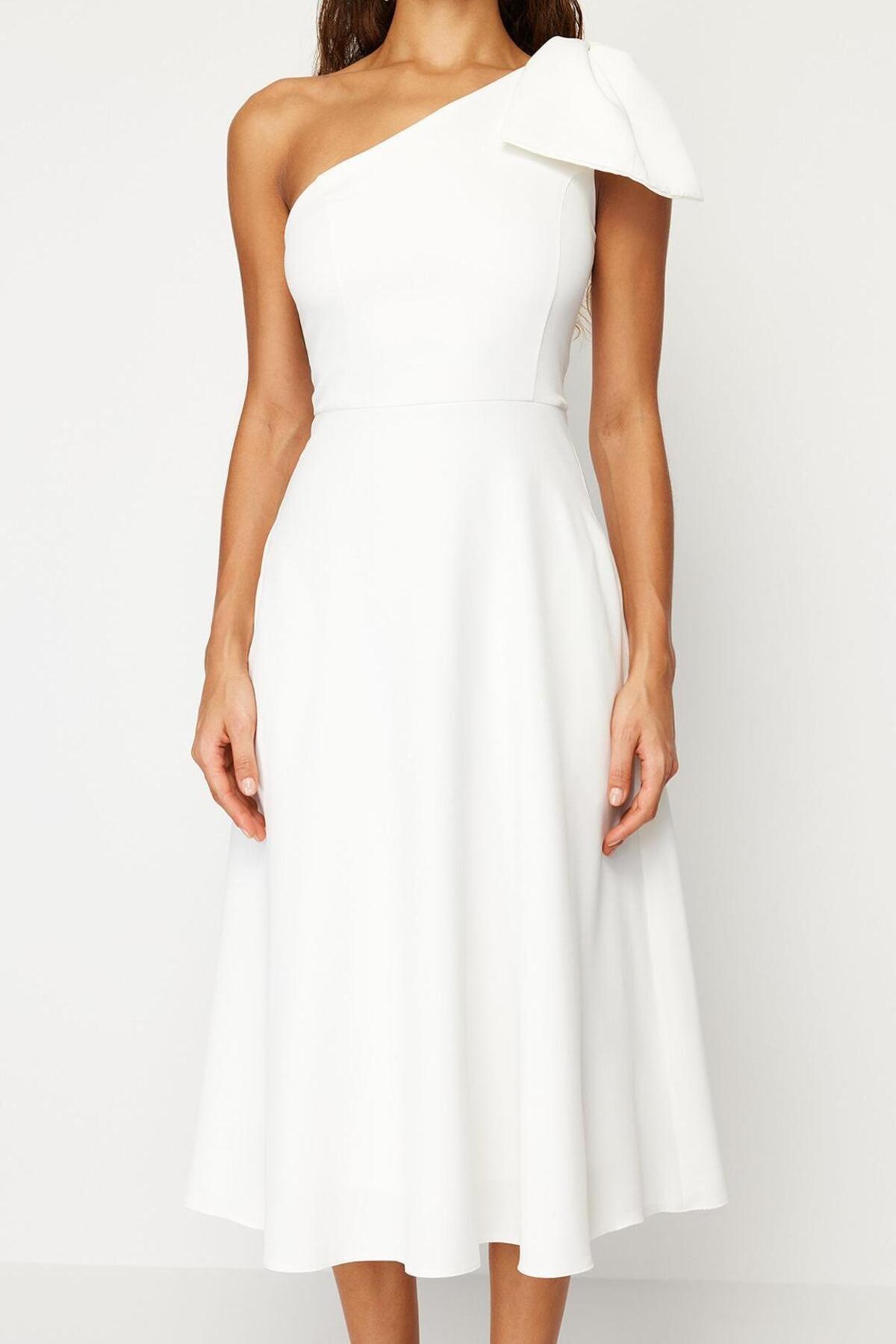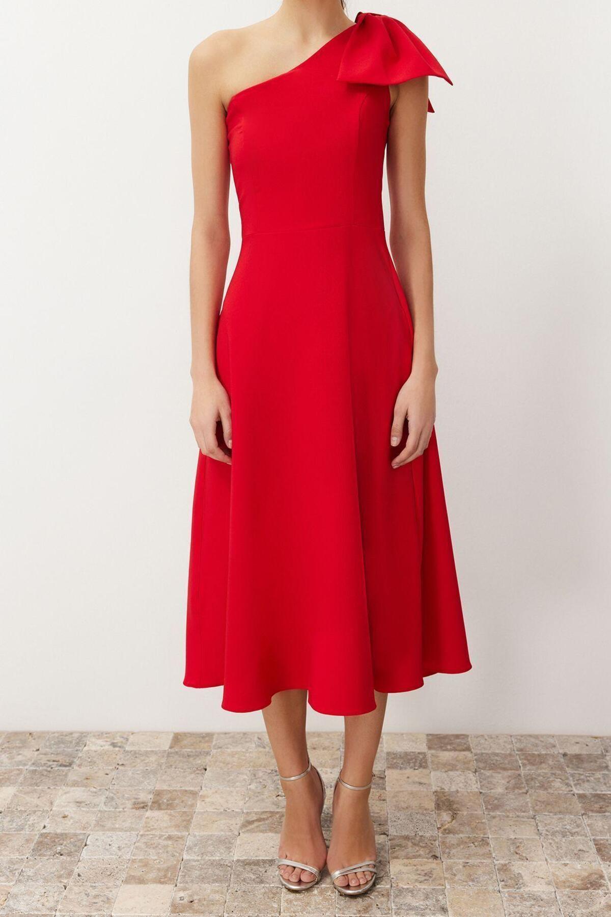Bu şık A kesim midi boy tek kol fiyonk detaylı abiye elbise, özel günlerinizde göz alıcı bir görünüm elde etmenizi sağlayacak. Yüksek kaliteli finikey dokuma kumaştan üretilen elbise, hem şık hem de konforludur. Asimetrik yakası ve tek kol tasarımı ile modern ve sofistike bir tarz sunarken, belden aşağı doğru genişleyen A kesimi, vücut hatlarınızı zarifçe ortaya koyuyor. Fiyonk detayı ise elbiseye ekstra bir feminenlik katıyor.