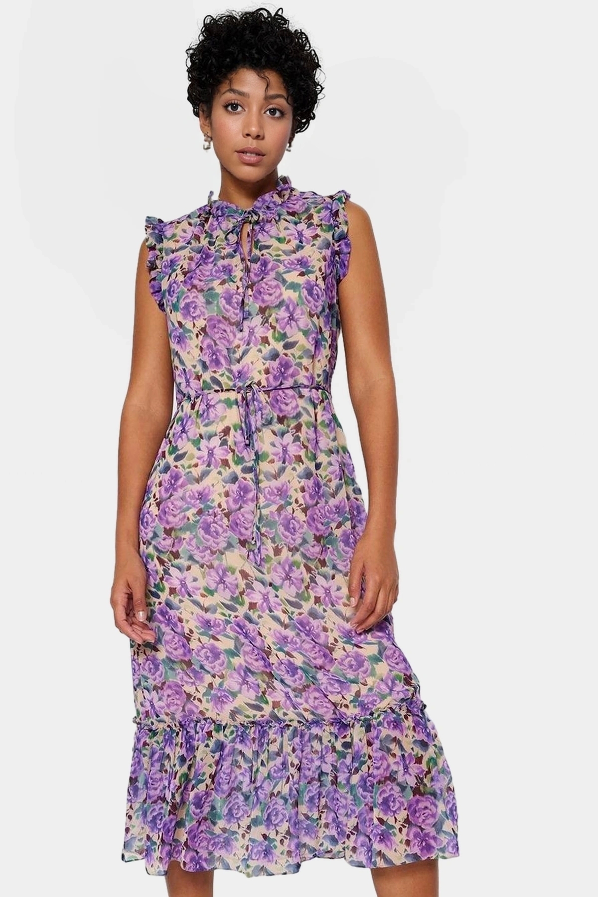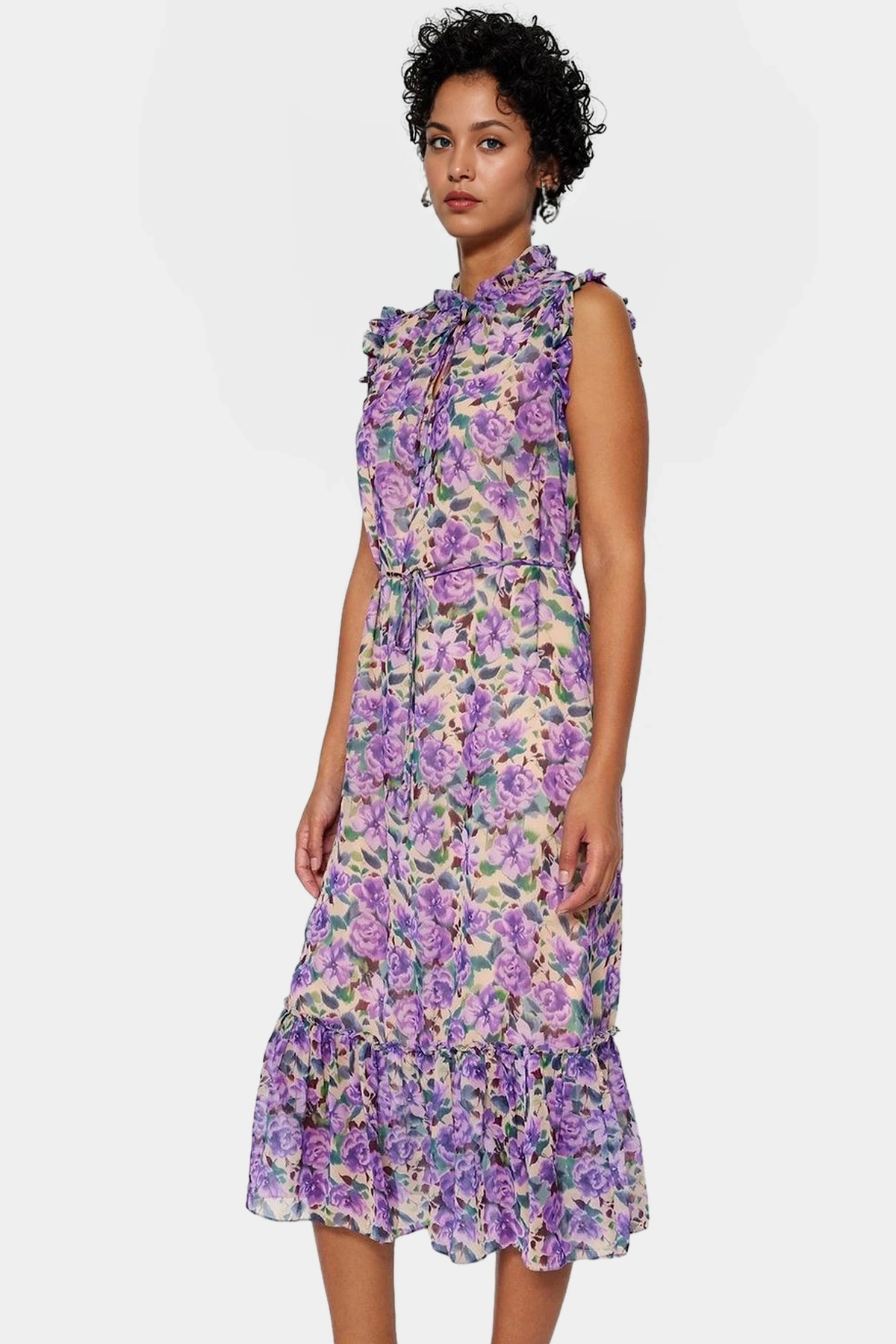 Şık Astarlı Şifon Elbise Çok Çiçek Desen Midi Boy Dik Yaka Rahat Kullanım Modern Stil