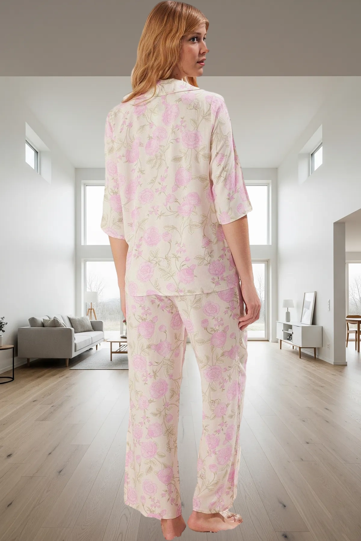 Şık Çiçek Desenli Viskoz Pijama Takımı; Rahat Nefes Alan 100% Kumaş Dayanıklı Malzeme