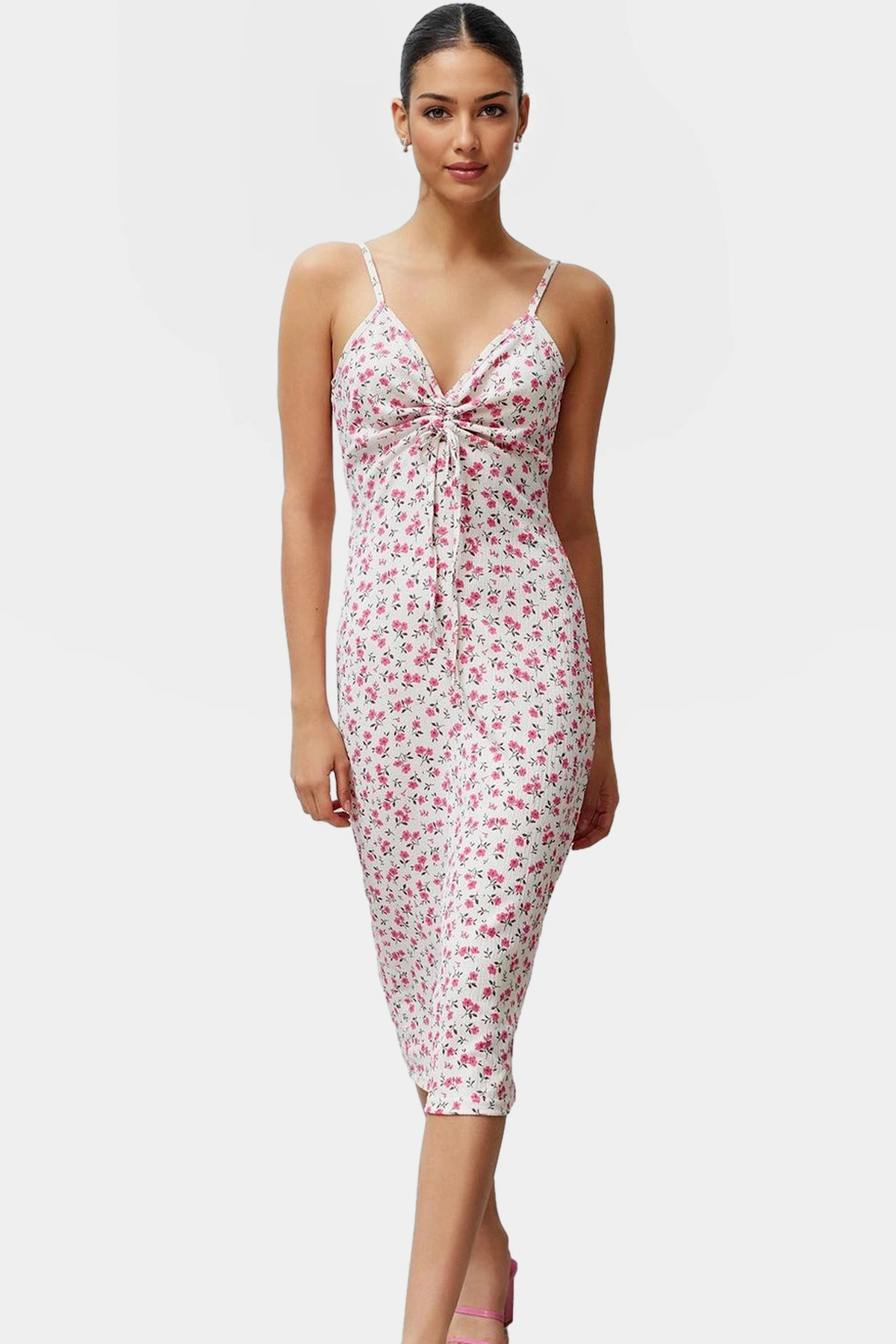 Bu muhteşem çiçek desenli elbiseyle yazın enerjisini yakalayın! Yüksek kaliteli, nefes alan örme kumaştan üretilen elbisemiz, gün boyu konforlu bir kullanım sunar. V yakası ve ince askılarıyla zarif ve modern bir görünüm elde edeceksiniz. A-line kesimi sayesinde her vücut tipine uyum sağlar ve hareket özgürlüğü tanır. Günlük kullanım için mükemmel olan bu elbise, stilinizi tamamlayacak ideal bir parça.