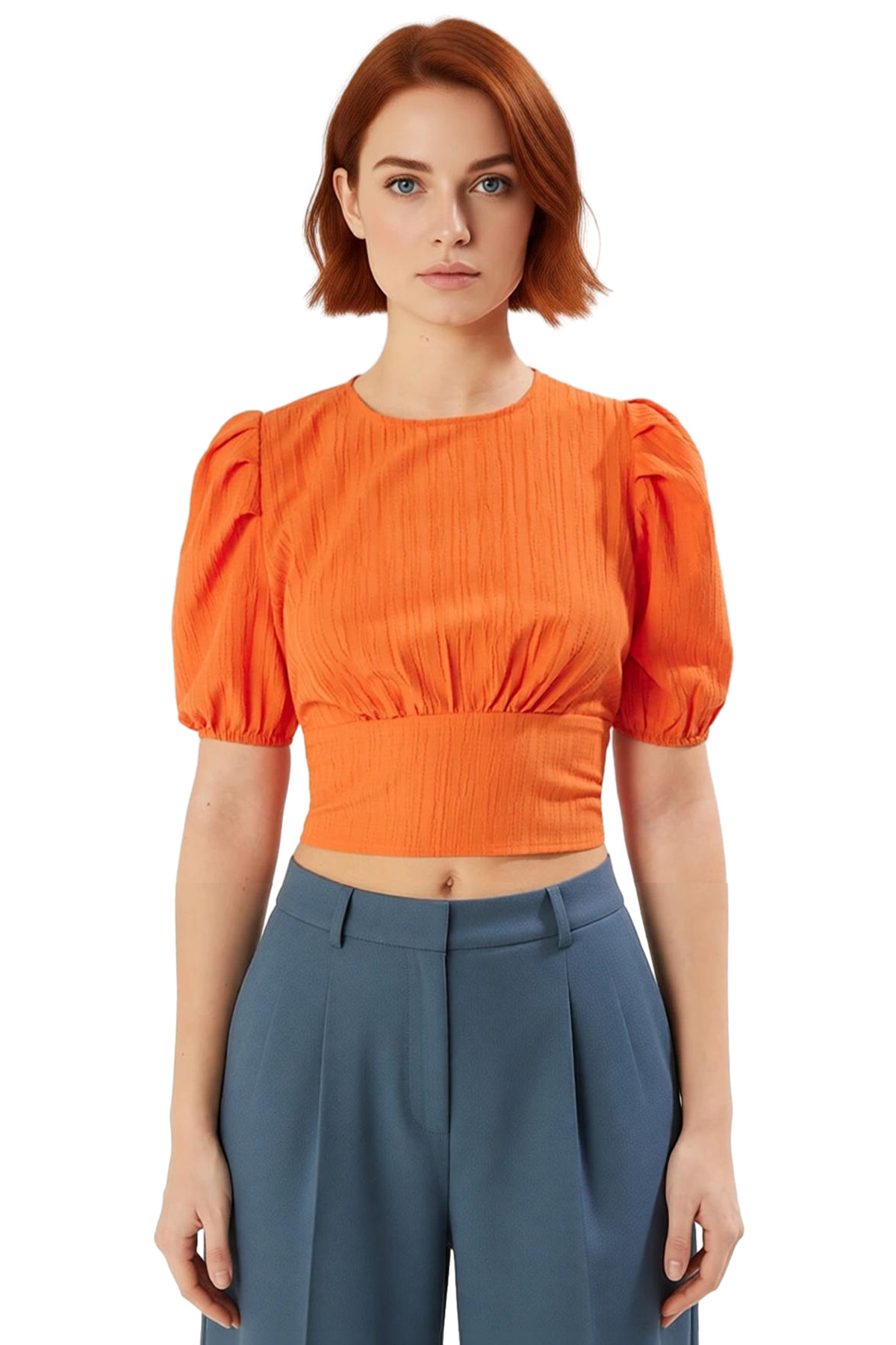 Şık Crop Bluz Bisiklet Yaka Kısa Kol Dokuma Kumaş Mükemmel Uyum Kaliteli İşçilik