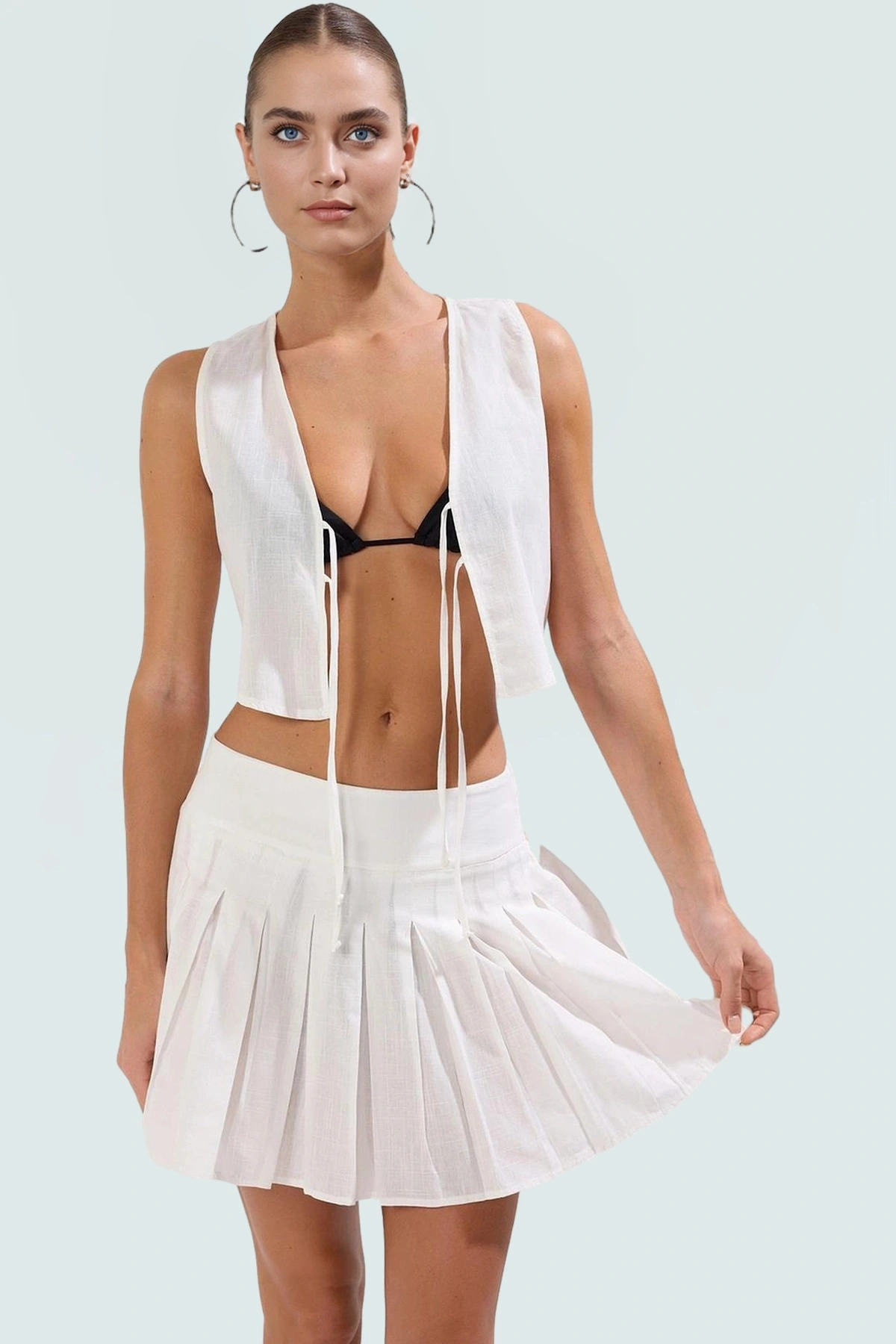 Rahatlığı ve şıklığı bir arada arayanlar için ideal bir seçim olan Ekru Pileli Flamlı Pamuk Bluz Etek Takımı, yaz aylarının sıcak günlerinde tarzınızdan ödün vermeden konforlu hissetmenizi sağlar. 100% pamuk dokuma kumaştan üretilen bu takım, nefes alabilir yapısıyla gün boyu ferahlık sunar. Crop bluzün önündeki bağcık detayı, takımın şıklığını tamamlarken, pileli etek ise hareket özgürlüğü sağlar. Fitted kalıp, vücut hatlarınıza uyum sağlayarak zarif bir görünüm yaratır.