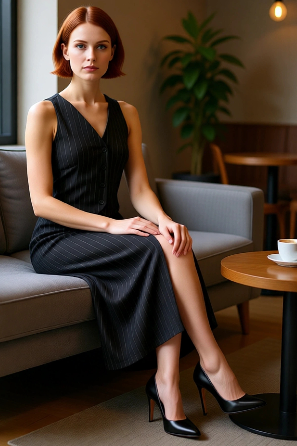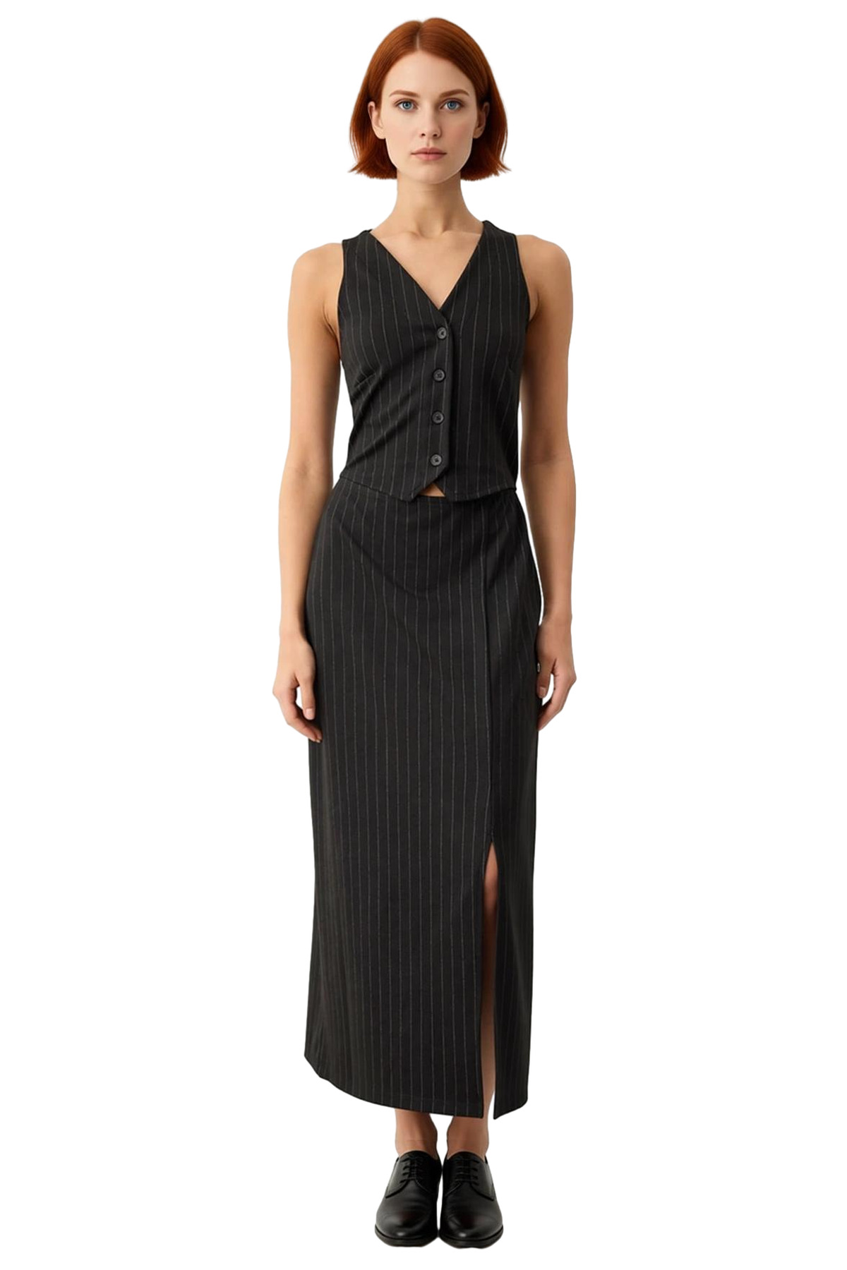 Ürün Özellikleri: Bodycon kalıp, polyester viskoz elastan materyal, çizgili desen, V yaka, kolsuz, örme kumaş, siyah renk, düğmeli tasarım.