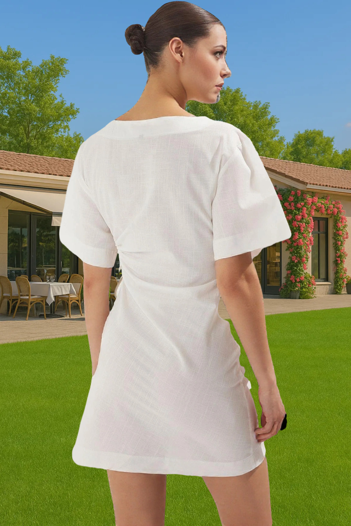Bu şık ve rahat mini elbise, yaz aylarının vazgeçilmez parçalarından biri olacak. Nefes alabilen 100% pamuk kumaşıyla gün boyu konfor sunarken, modern ve feminen tasarımıyla da dikkatleri üzerinize çekeceksiniz. Cut out detayı ve vücudu saran kesimiyle, hem şık hem de rahat bir görünüm elde edeceksiniz. Plajda, şehirde veya bir akşam yemeğinde; her ortamda rahatlıkla kullanabileceğiniz bu elbise, stilinizi tamamlayacak mükemmel bir seçenektir.
