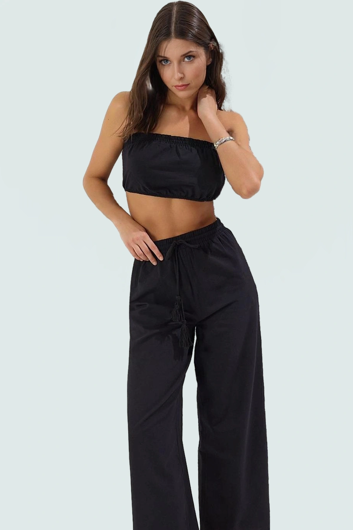 Bu şık ve rahat plaj takımı ile yazın tadını çıkarın! 100% pamuk kumaştan üretilen bu takım, gün boyu konfor ve serinlik sunuyor. Fitted kalıbıyla vücudunuza mükemmel oturan takım, straplez üstü ve bol paça şortuyla modern ve şık bir görünüm yaratıyor. Plajda, havuz başında veya günlük kullanım için ideal.
