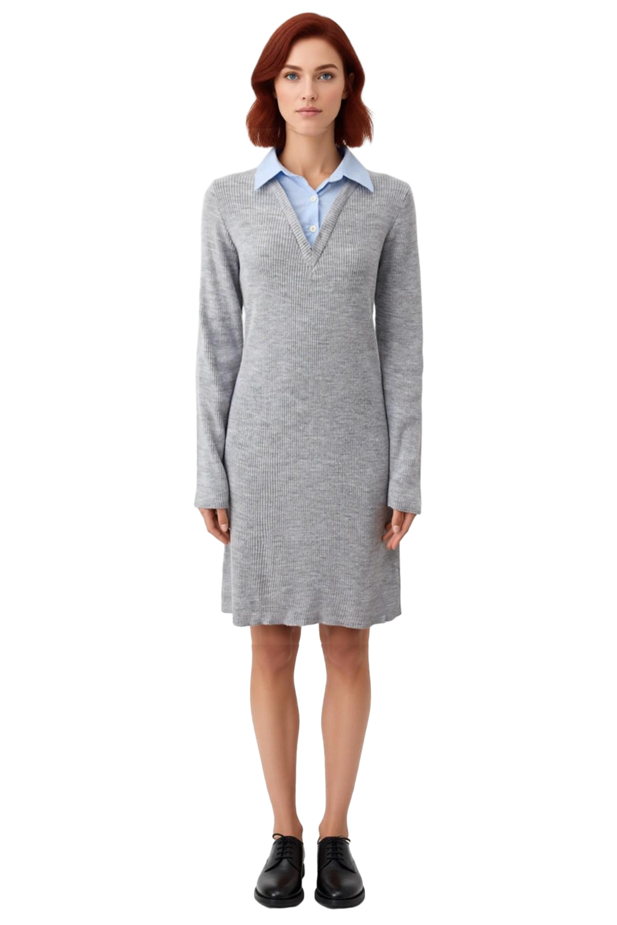Şık Kadın Renk Bloklu Gömlek Yaka Detaylı Uzun Kollu Triko Mini Elbise Kış Kombinleri İçin İdeal