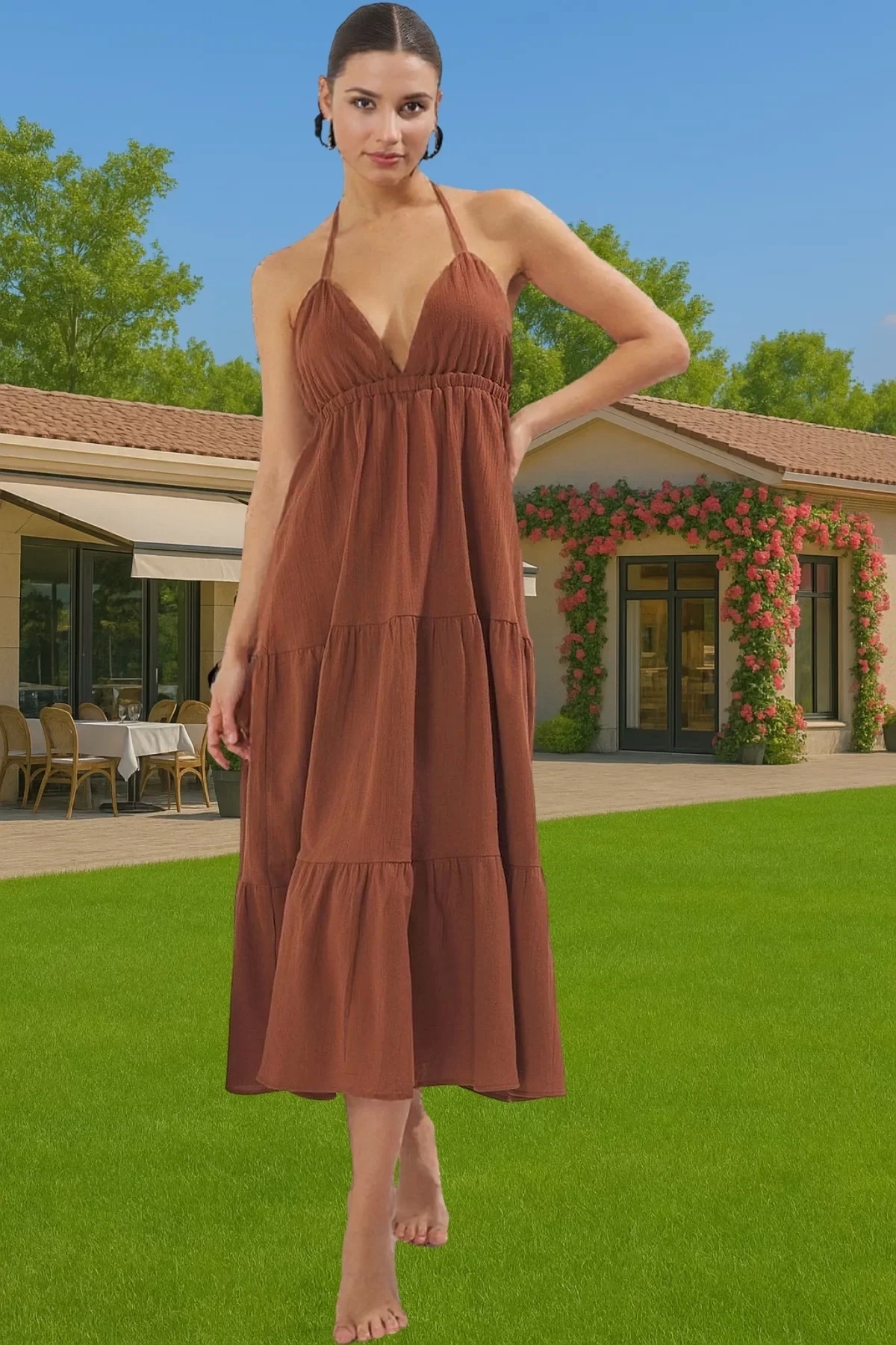 Şık Kadın Yazlık Maxi Elbise Pamuklu Crinkle Dokuma A Line Uzun Ömürlü Günlük Kullanım İçin