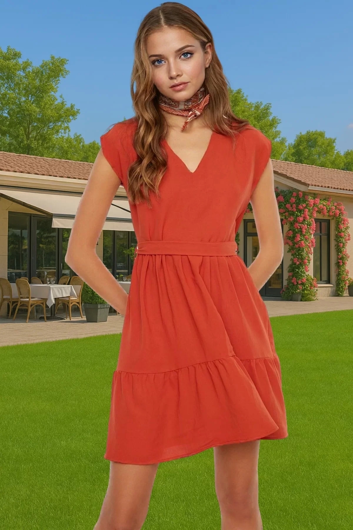Yaz aylarının vazgeçilmez parçası olacak bu şık mini elbise, hem şıklığı hem de konforu bir arada sunuyor. V yakası ve bel kısmındaki kuşak detayıyla feminen bir görünüm sergilerken, hafif ve nefes alan polyester kumaşıyla gün boyu rahat etmenizi sağlar. Dokuma kumaş yapısı sayesinde mükemmel bir form tutar ve kolayca ütülenir. Kolsuz tasarımıyla sıcak havalarda serin kalırken, regular kalıbıyla her vücut tipine uyum sağlar.