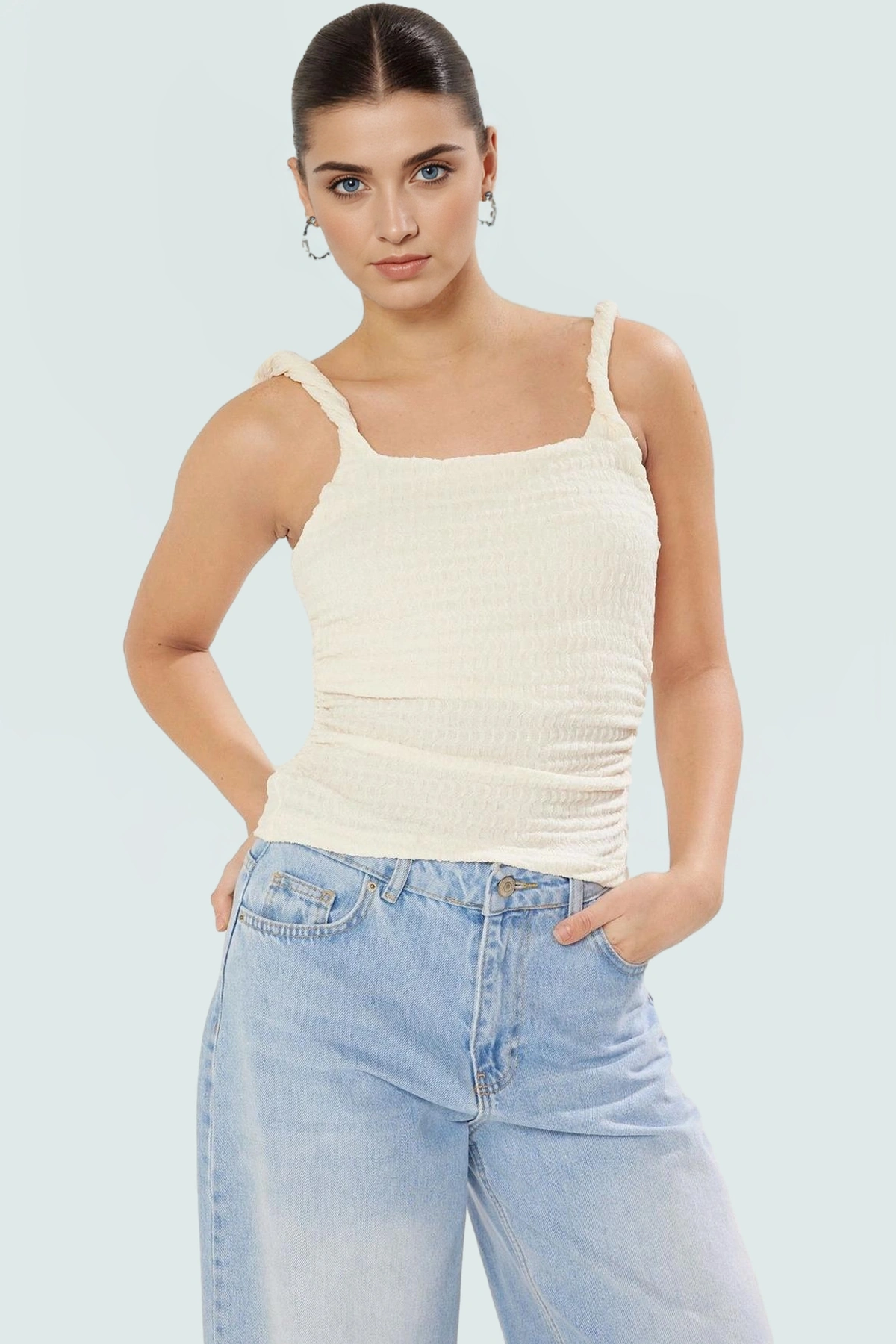 Bu şık ekru bluz, yaz aylarında hem şık hem de rahat bir görünüm elde etmenizi sağlar. Fitted kalıbı, vücudunuza mükemmel bir şekilde otururken, kolsuz tasarımı size özgürlük ve serinlik hissi verir. Kare yaka detayı, bluza zarif bir hava katar. %58 pamuk, %41 polyester ve %1 elastan karışımıyla üretilen kumaş, nefes alabilir ve yumuşak bir dokuya sahiptir. Gün boyu konforlu bir kullanım sunar.
