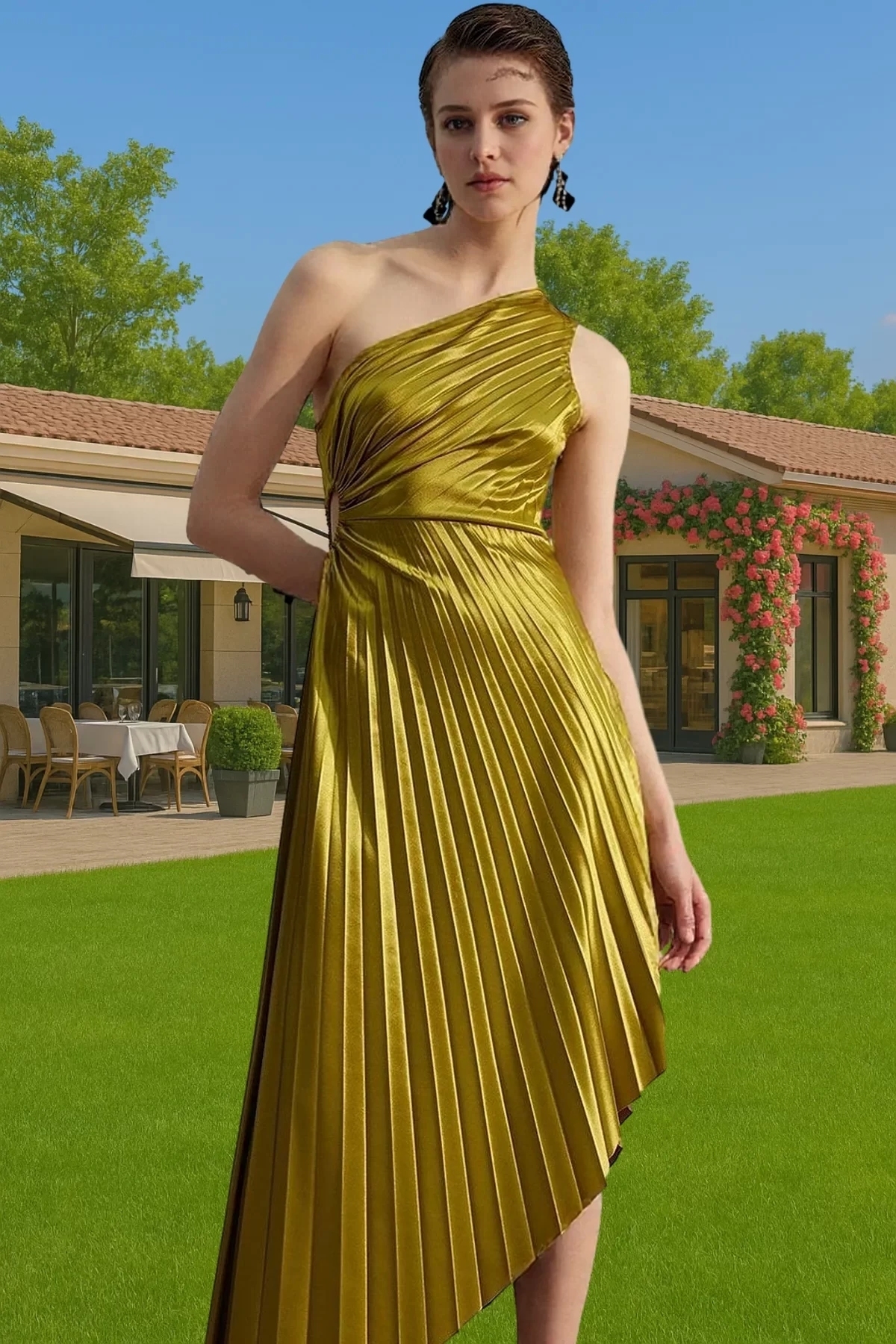 Saten kumaşın yumuşak ve pürüzsüz dokusu, teninizde ipeksi bir his bırakırken, pliselerin hareketli görünümü, elbiseye dinamik bir hava katıyor. Tek omuz tasarımı, omuzlarınızı ve kolunuzu zarifçe ortaya çıkararak, şık ve modern bir siluet oluşturuyor. %95 polyester ve %5 elastan karışımı olan kumaş, esnek yapısıyla gün boyu konforlu bir kullanım sunuyor.