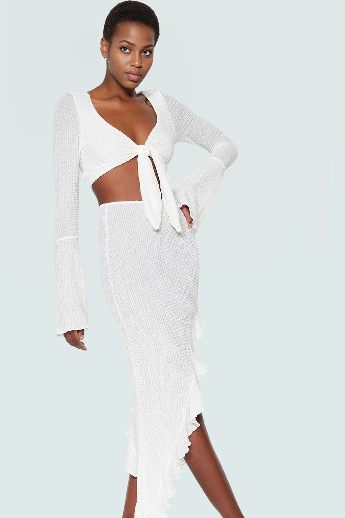 Şık Plaj Takımı Gofre Dokuma Fitted Kalıp İspanyol Kol Modern Stil
