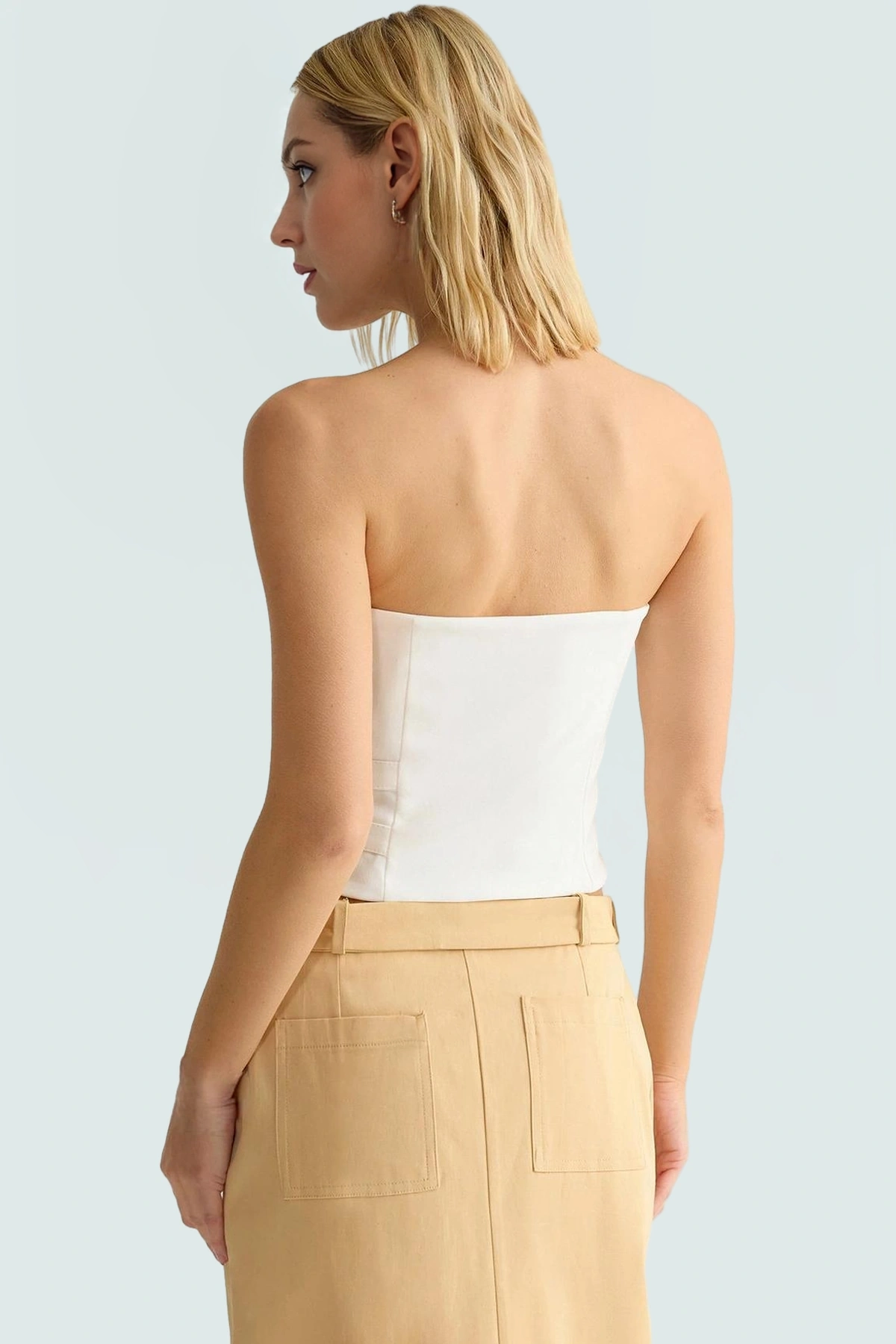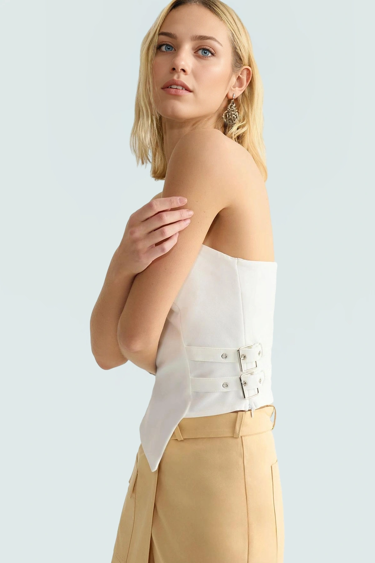 Rahatlığı ve şıklığı bir arada arayan modern kadınlar için tasarlanan bu beyaz straplez bluz, yaz aylarının vazgeçilmezi olmaya aday. Polyester ve elastan karışımı dokuma kumaş, nefes alabilirliği ve rahatlığıyla gün boyu konfor sunarken, straplez yaka ve fitted kalıbıyla da feminen bir görünüm yaratıyor. Kemer toka detayı, bluza şık bir dokunuş katıyor ve onu diğerlerinden ayırıyor. İşlevsellik ve estetiğin mükemmel birleşimi olan bu bluz, gardırobunuzdaki diğer parçalarla kolayca kombinlenebilir.