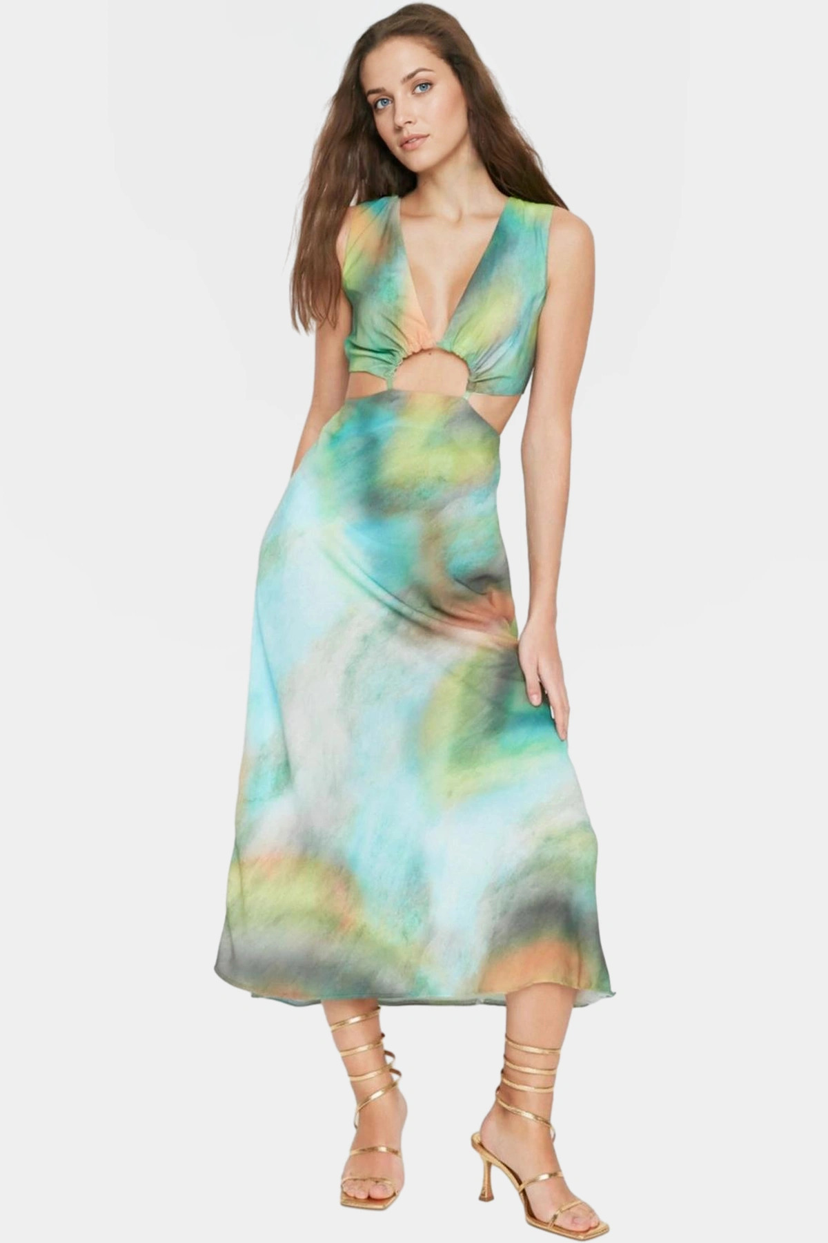 Bu büyüleyici maxi elbise, yaz günlerinde şık ve rahat bir stil arayanlar için mükemmel bir seçim. V yakası ve A-line kesimiyle feminen bir siluet oluştururken, keten görünümlü dokuma kumaşıyla da konforlu bir his sunuyor. Batik desenin büyüleyici renkleri, her adımınızda özgün ve göz alıcı bir görünüm yaratıyor. Cut-out ve volan detayları, elbiseye modern ve trend bir hava katıyor. Günlük kullanım kadar özel davetlerde de rahatlıkla tercih edilebilecek bu elbise, her anınıza stil katacak. Keten görünümlü dokuma kumaş, hem şık hem de nefes alabilir bir yapıya sahip. Polyester içeriği sayesinde kolay kırışmaz ve uzun süreli kullanım için dayanıklıdır. A-line kalıbı, vücut hatlarınıza mükemmel şekilde uyum sağlayarak rahat hareket etmenizi sağlar. Kolsuz tasarımıyla yaz sıcağında serin kalmanıza yardımcı olurken, V yakasıyla da boyun bölgenizi daha uzun gösterir. Elbisenin temizliği oldukça kolaydır; makinede yıkayabilirsiniz. Modelin ölçüleri: Boy: 170 cm, Göğüs: 80 cm, Bel: 59 cm, Kalça: 88 cm. Mankenin üzerindeki ürün 36 bedendir. Elbisenin ön boyu 130 cm'dir. Bu çok yönlü elbiseyi, plajdan akşam davetlerine kadar birçok farklı ortamda kullanabilirsiniz. Şık bir çanta, zarif takılar ve topuklu ayakkabılarla kombinleyerek özel günlerde göz kamaştırıcı bir görünüm elde edebilirsiniz. Günlük kullanımda ise, düz sandaletler ve hasır bir çantayla rahat ve şık bir tarz yaratabilirsiniz. – Kumaş Tipi: Dokuma – Materyal: Polyester – Kalıp: A-line – Persona: Fashion Forward – Kol Tipi: Standart Kol – Desen: Batik – Yaka Tipi: V Yaka – Kol Boyu: Kolsuz – Ürün Detayı: Cut Out / Volan – Cep: Cepsiz – Astar Durumu: Astarsız – Boy: Maxi – Siluet: A-line – Ortam: Gündüz / Gece – Dokuma Tipi: Keten görünümlü – Ek Özellik: A Kesim – Kemer/Kuşak Durumu: Kemersiz – Sürdürülebilirlik Detayı: Hayır – Materyal Bileşeni: 100% Polyester – Sezon: Yaz – Menşei: TR – Modelin Ölçüleri: Boy: 170cm(59) Göğüs 80cm(31In) Bel: 59cm(22In) Kalça: 88cm(34in) – Mankenin üzerindeki ürün: 36 beden – Model Ön Boyu: 130,0 cm