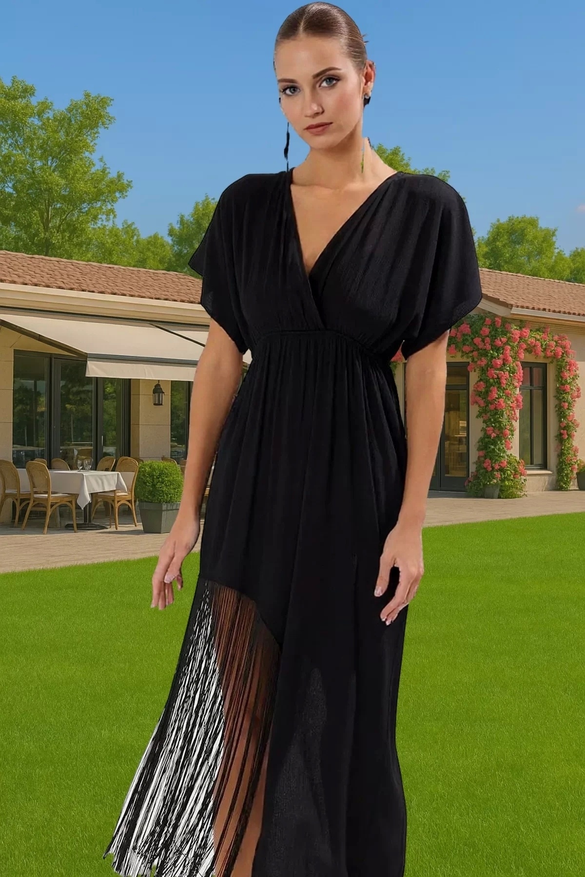 Yan kısımdaki püskül detayı, elbiseye hareketlilik katar ve benzersiz bir tarz oluşturur.