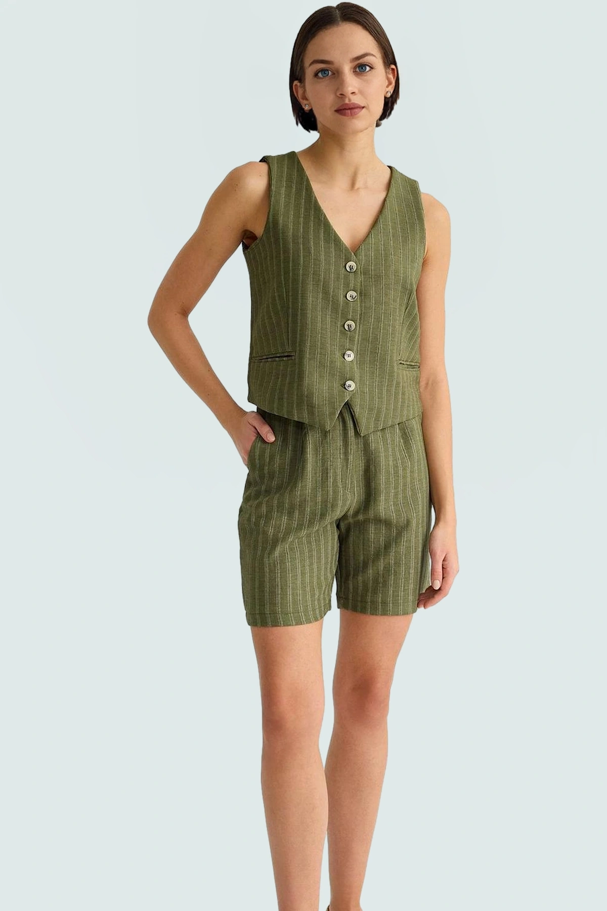 Bu yazlık takım ile şıklığı ve rahatlığı bir arada yakalayın! Yüksek kaliteli Viskon Süprem dokuma kumaştan üretilen yelek ve şort, nefes alabilir yapısıyla yaz sıcağında bile konfor sunuyor. Modern V yaka detayı ve ince çizgili tasarımı ile stilinizi yansıtın. Yüksek bel şort ise bacaklarınızı daha uzun ve ince gösterecek şekilde tasarlandı.