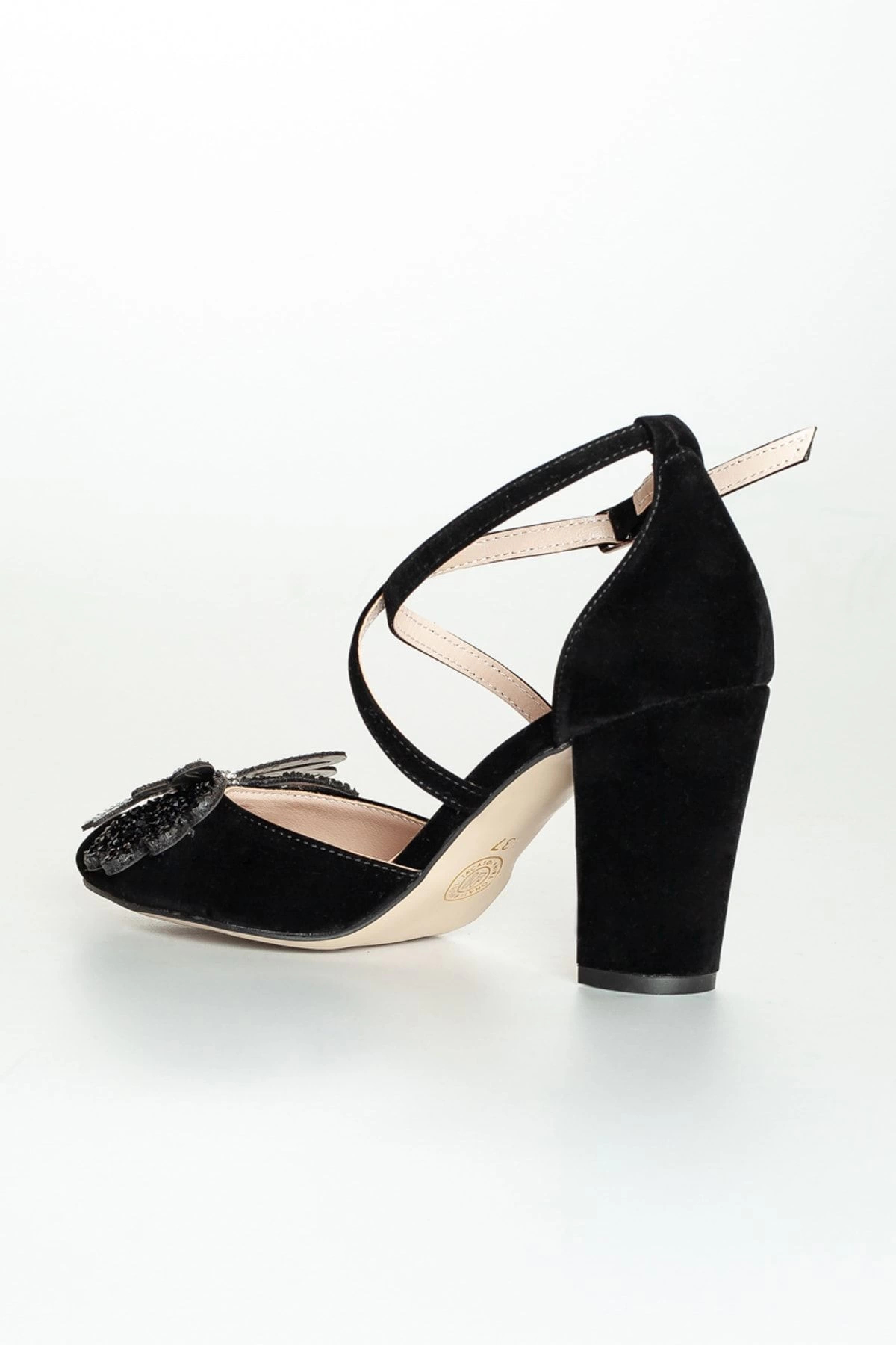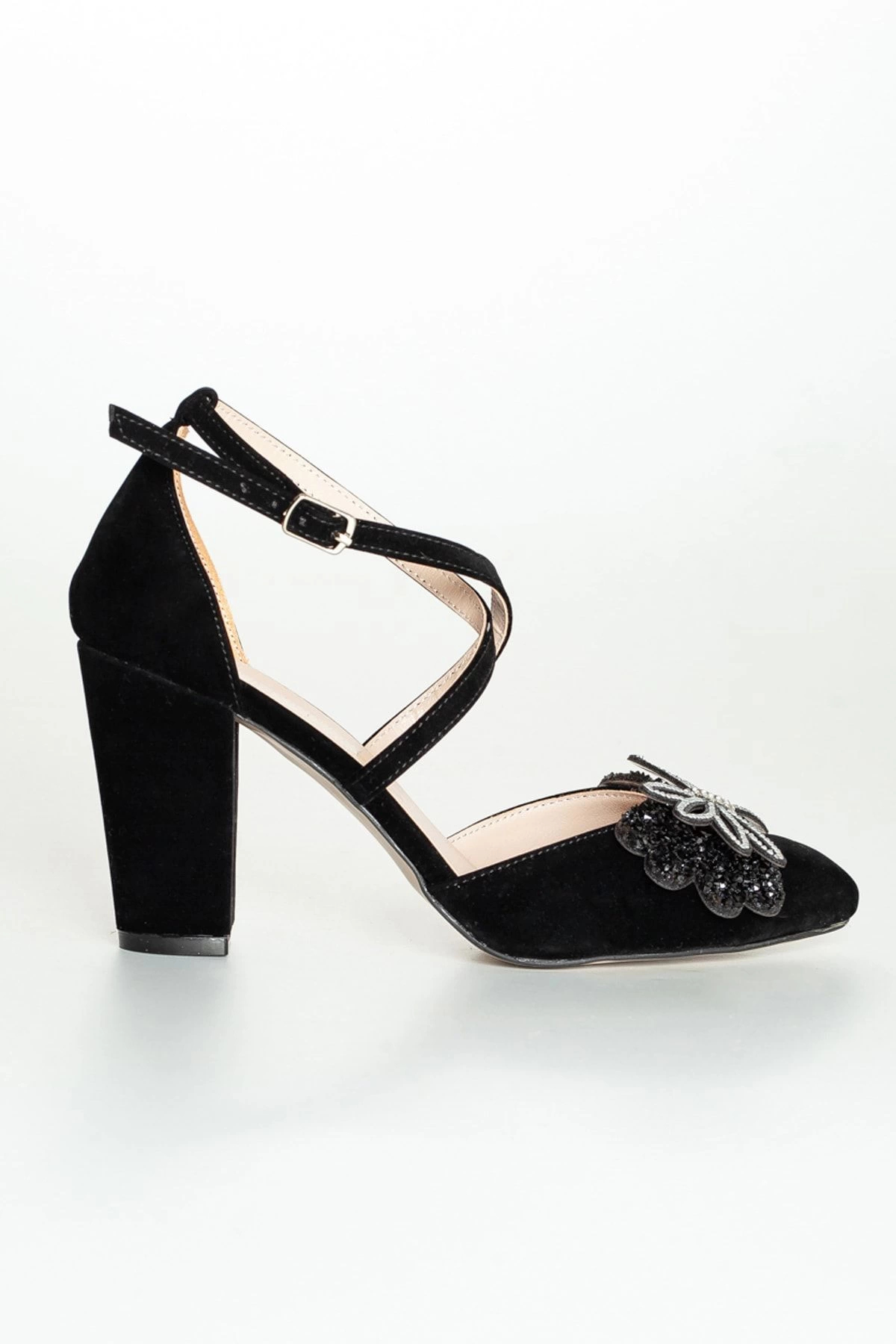 Şık ve gece ortamları için ideal, siyah süet taşlı kadın topuklu ayakkabı, zarif tasarımıyla göz alıcı bir görünüm sunar.
