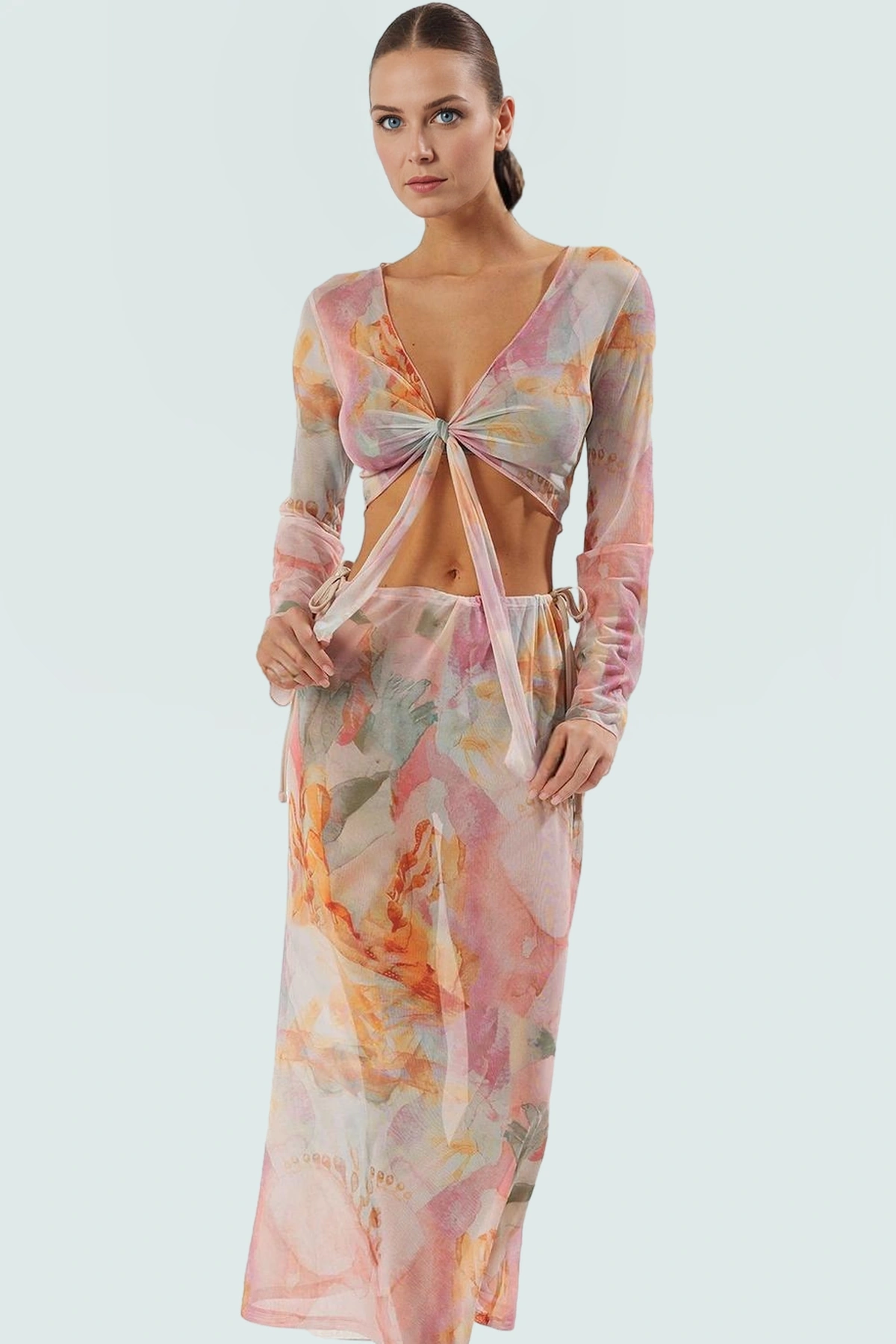 Materyal Bileşeni: 100% Polyester; Kumaş Tipi: Örme; Desen: Soyut; Renk: Çok Renkli; Kol Tipi: Reglan Kol; Boy: Uzun; Dokuma Tipi: Mesh; Astar Durumu: Astarsız; Yıkama Talimatı: T35; Menşei: TR; Kalıp: Fitted; Yaka Tipi: Dik Yaka; Kol Boyu: Uzun; Ortam: Beachwear; Alt-Üst Takım: Bluz-Etek; Persona:Feminine; Sezon:Yaz Bu ürün, yüksek kalite standartlarına uygun olarak üretilmiştir. Günlük kullanımda konfor ve şıklığı bir arada sunar. Uzun ömürlü malzemesi sayesinde yıllarca kullanabilirsiniz. Modern tasarımı ile her ortamda dikkat çeker. Özenle seçilmiş kumaşı ve işçiliği ile fark yaratır. Rahat kesimi ve ergonomik tasarımı ile gün boyu konforu garanti eder.