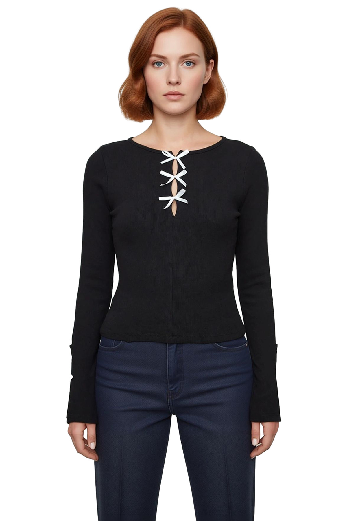 Desen:Düz Yaka Tipi:Bisiklet Yaka Materyal:Pamuklu Kol Tipi:Standart Kol Kalıp:Slim Kumaş Tipi:Örme Renk:Siyah Cep:Cepsiz Ürün Detayı:Fiyonklu Ürün Tipi:Düz Astar Durumu:Astarsız Boy:Regular Kol Boyu:Uzun Ortam:Casual/Günlük Siluet:Basic Dokuma Tipi:Kaşkorse Ek Özellik:Cut Out Persona:Fashion Forward Kemer/Kuşak Durumu:Kemersiz Sürdürülebilirlik Detayı:Hayır Materyal Bileşeni:97% Pamuk, ,3% Elastan Yıkama Talimatı:T05 Yaş:Tüm Yaş Grupları Model Bilgisi: Modelin Ölçüleri: Boy: 176cm(59) Göğüs: 80cm(31in) Bel: 59cm(23in) Kalça: 89cm(35in).